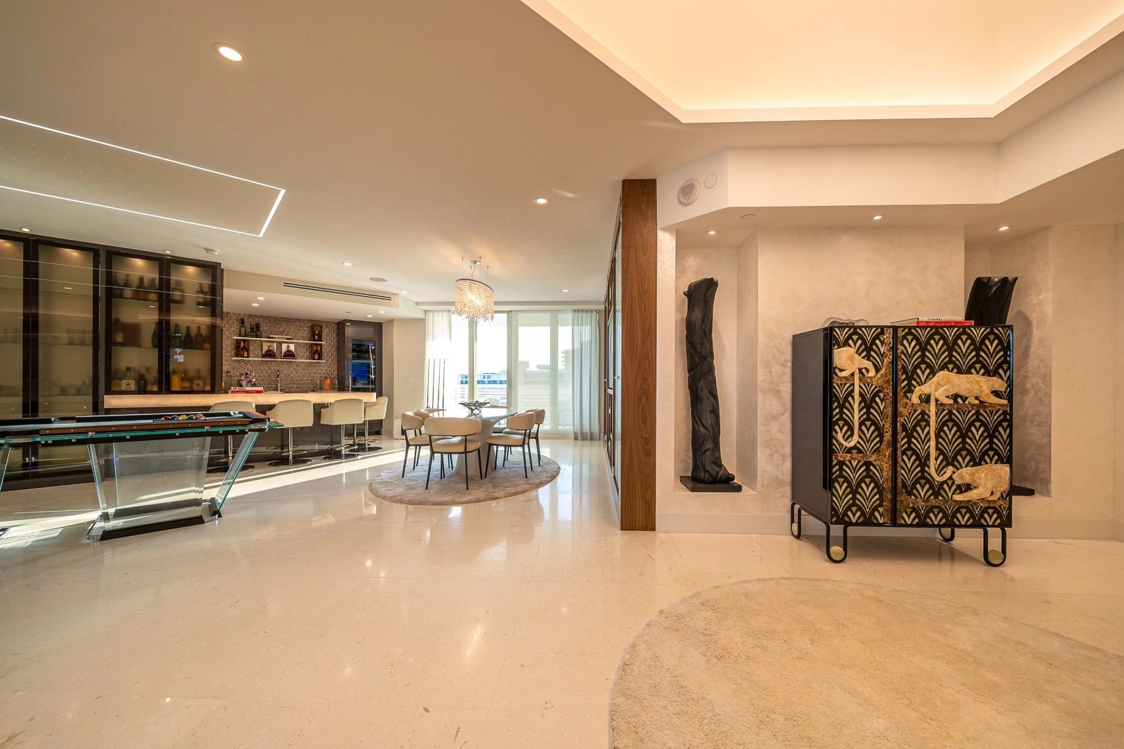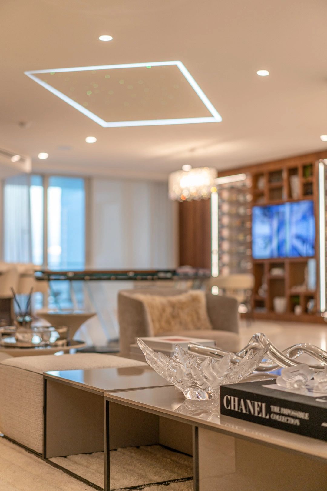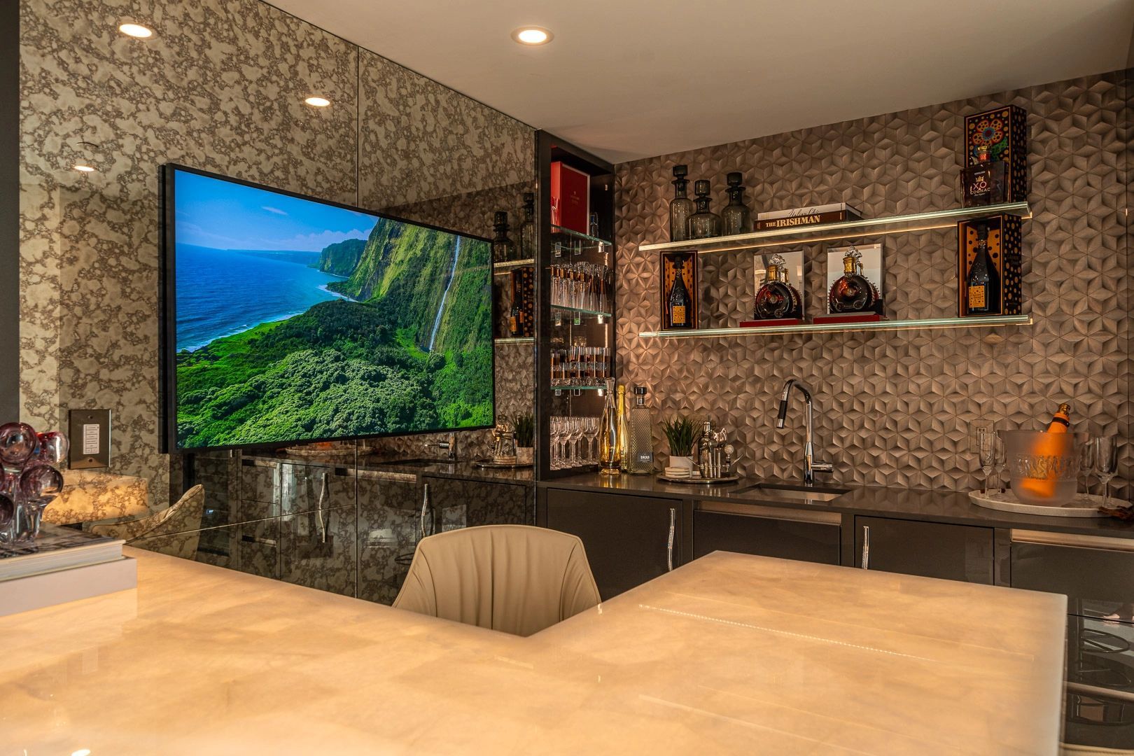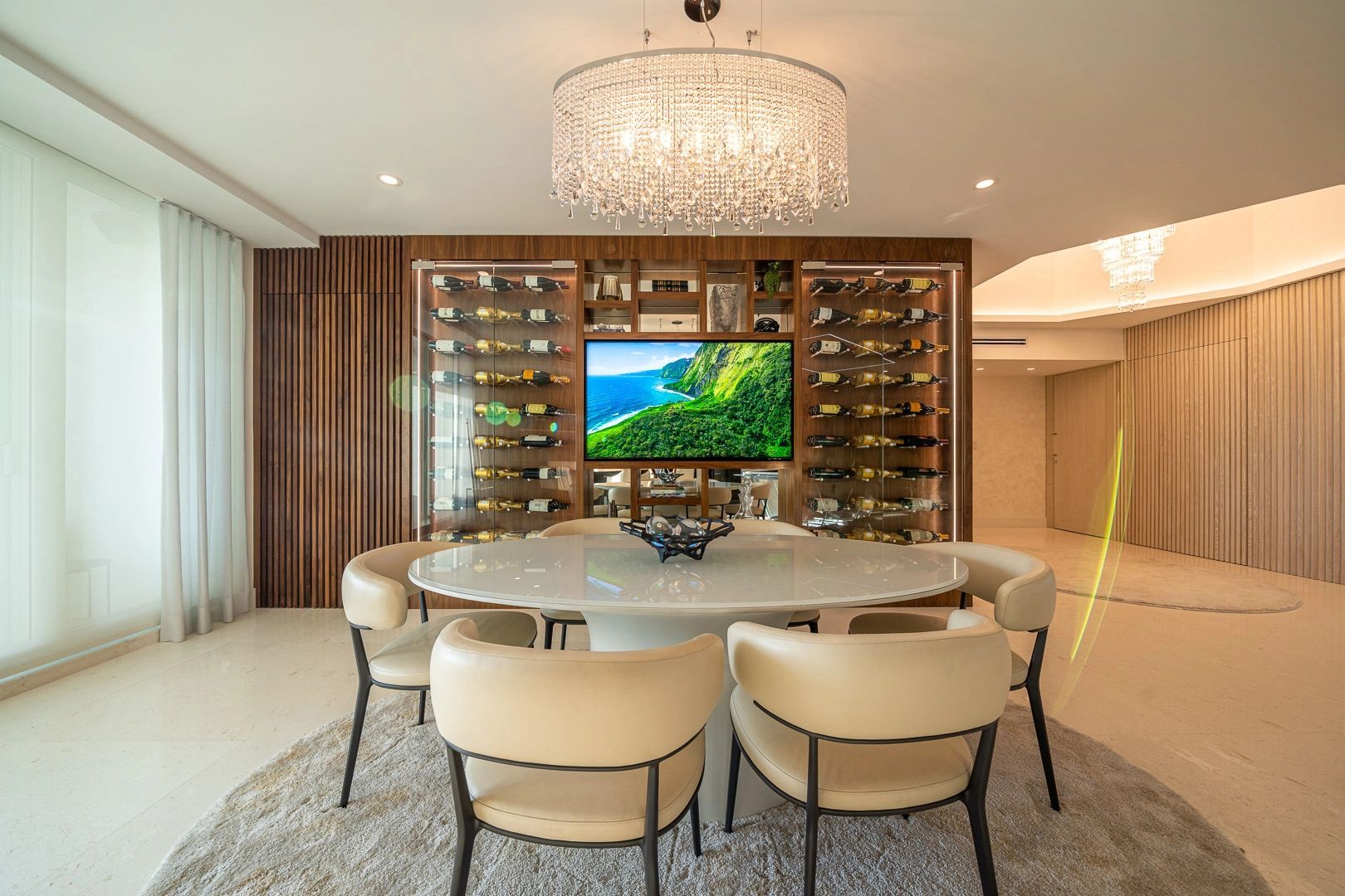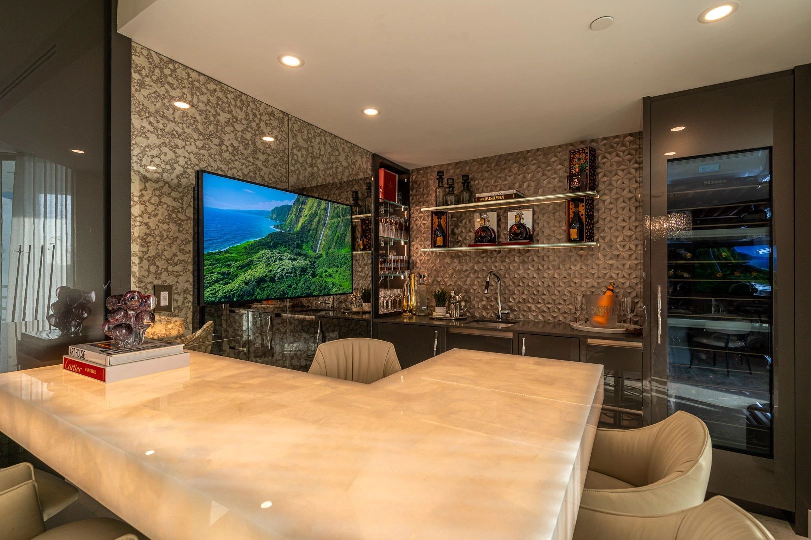 Our custom furniture selection includes pieces from BB Italia, Maxalto, Potocco, and Stark, complemented by cashmere rugs and Swarovski crystal chandeliers. The wine displays are adorned with crystal, and the bar features a collection of Louis XV. With TVs that drop from the ceiling, ocean-facing showers, and countless other exceptional features, this project is a testament to luxury beyond measure."