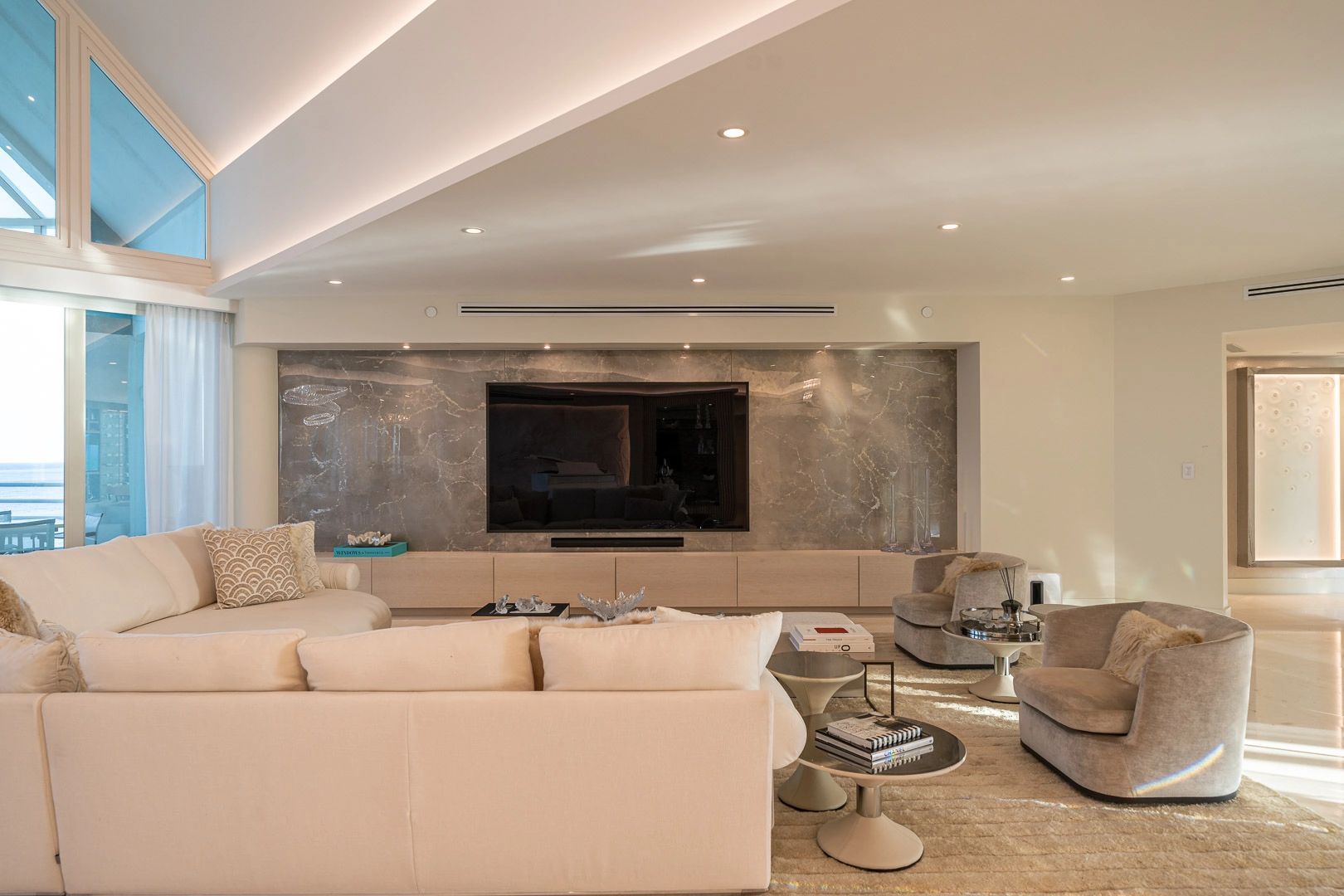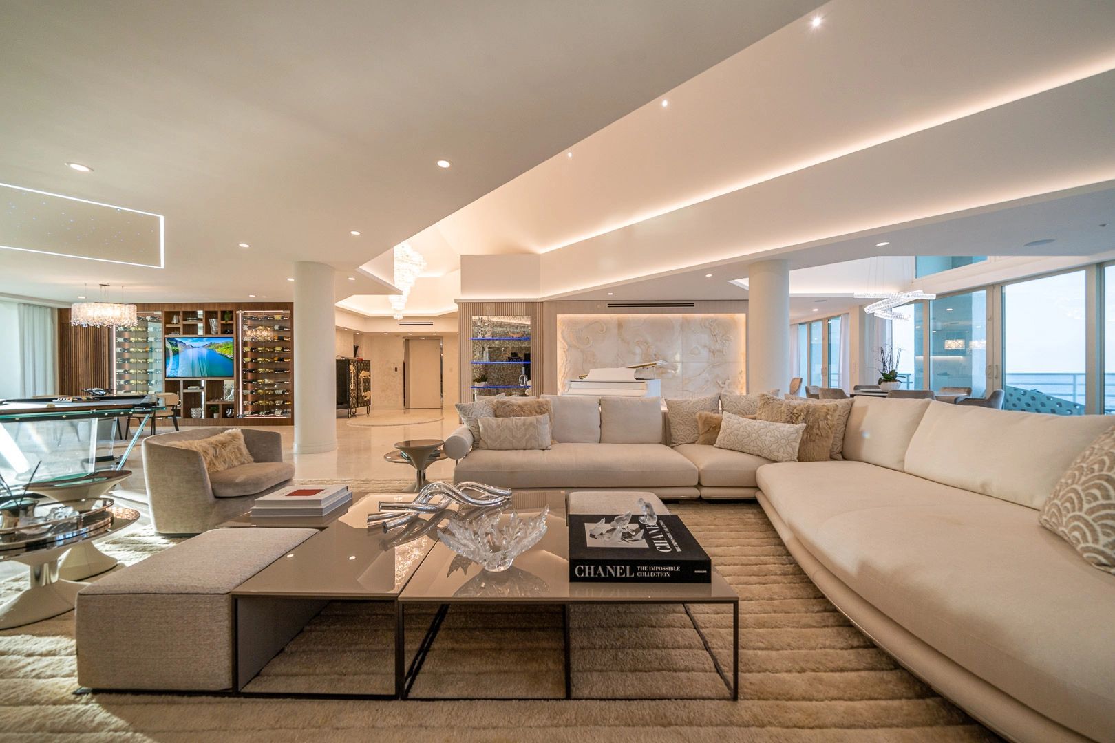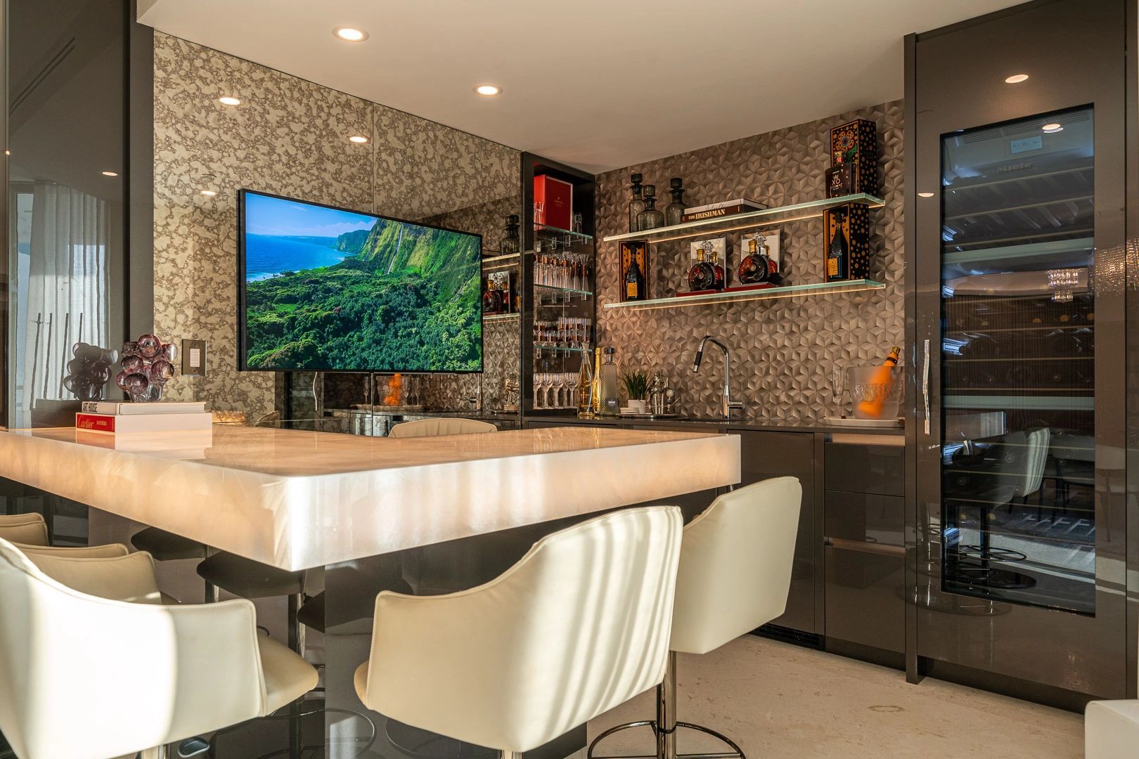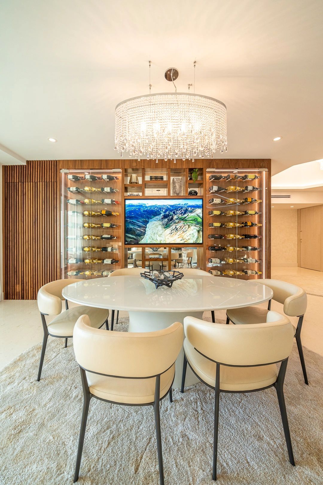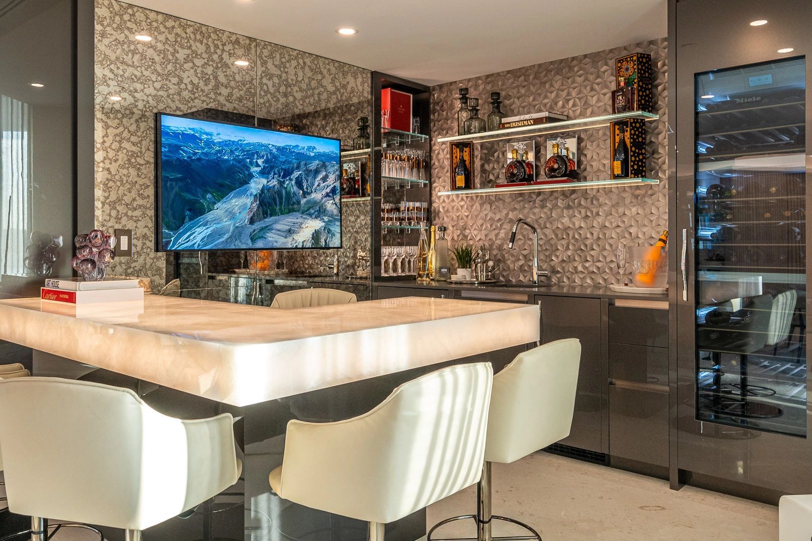 Our custom furniture selection includes pieces from BB Italia, Maxalto, Potocco, and Stark, complemented by cashmere rugs and Swarovski crystal chandeliers. The wine displays are adorned with crystal, and the bar features a collection of Louis XV. With TVs that drop from the ceiling, ocean-facing showers, and countless other exceptional features, this project is a testament to luxury beyond measure."