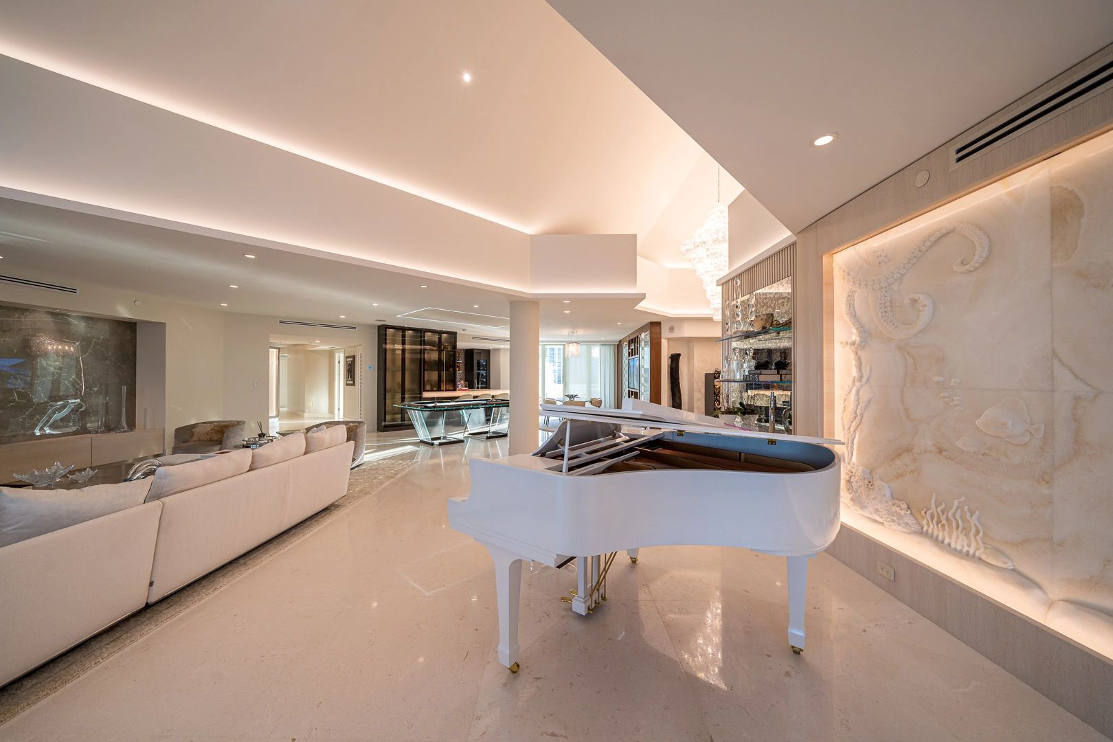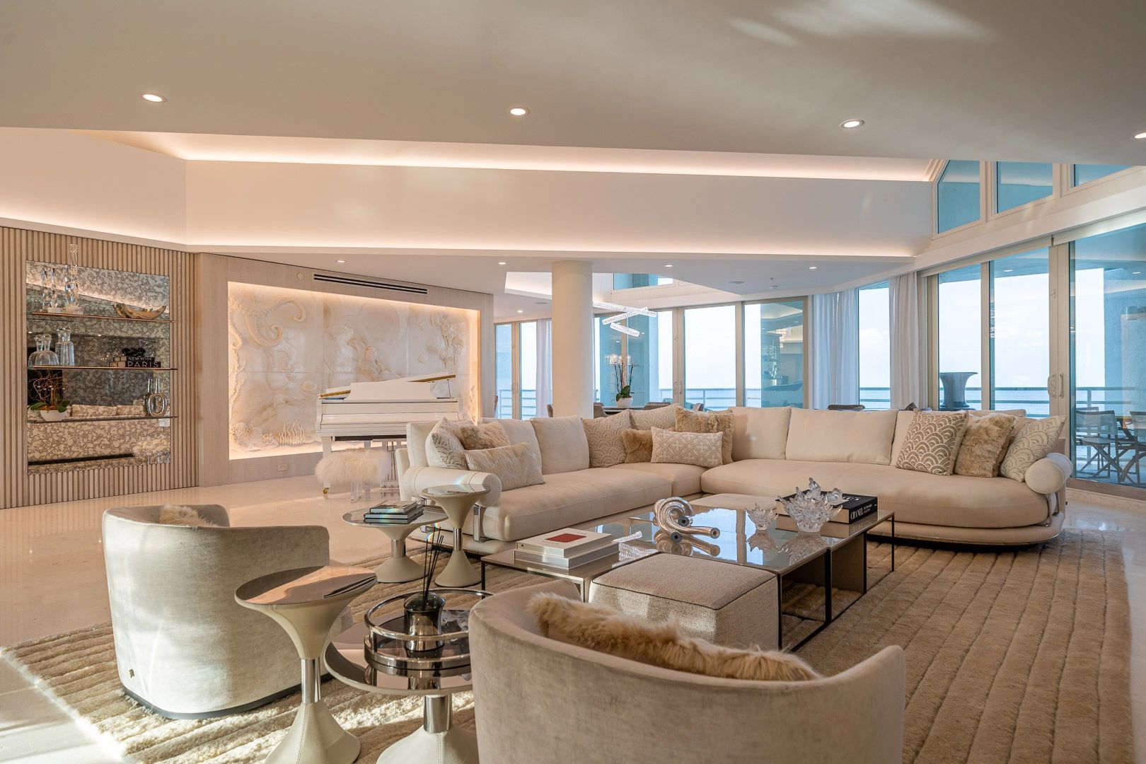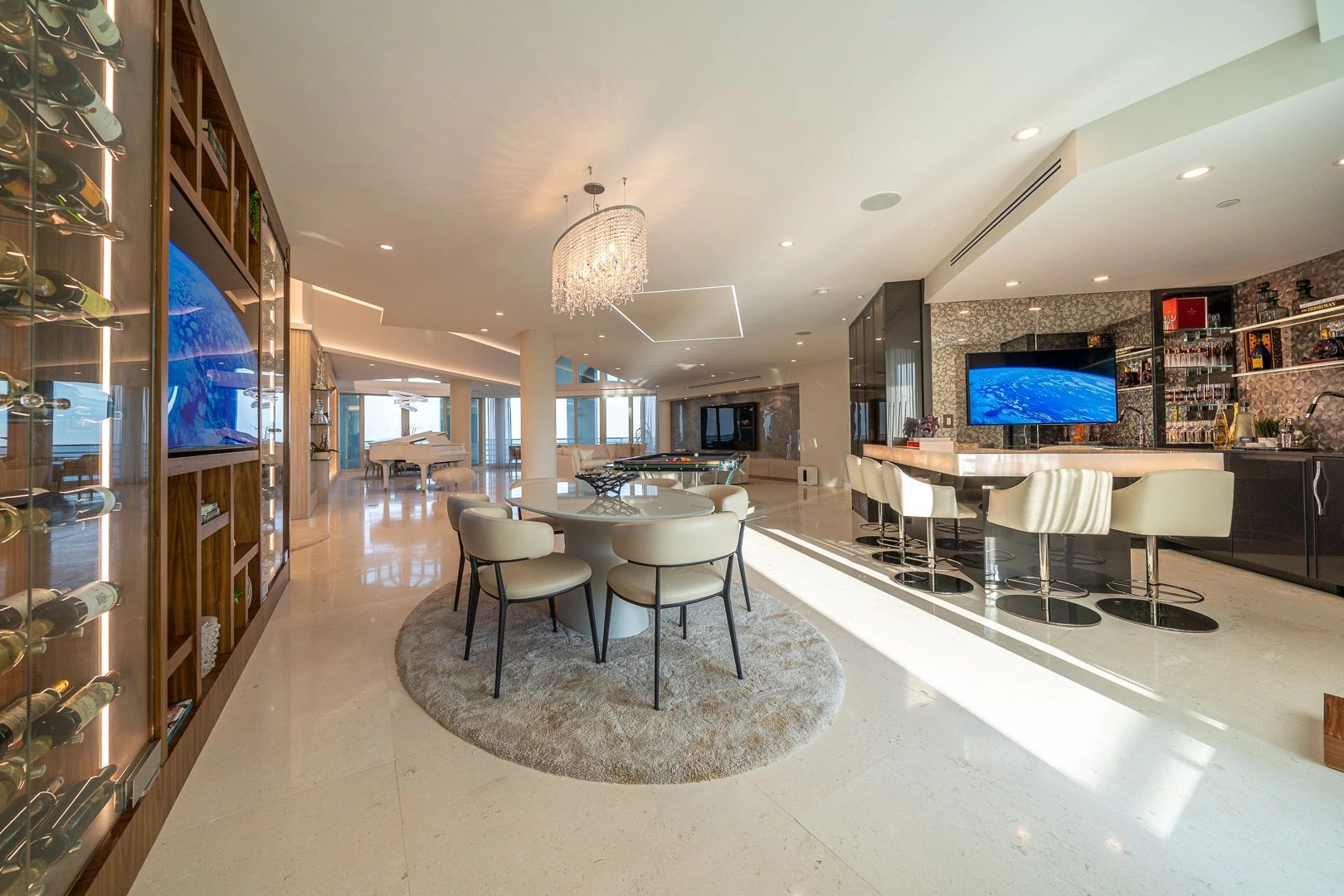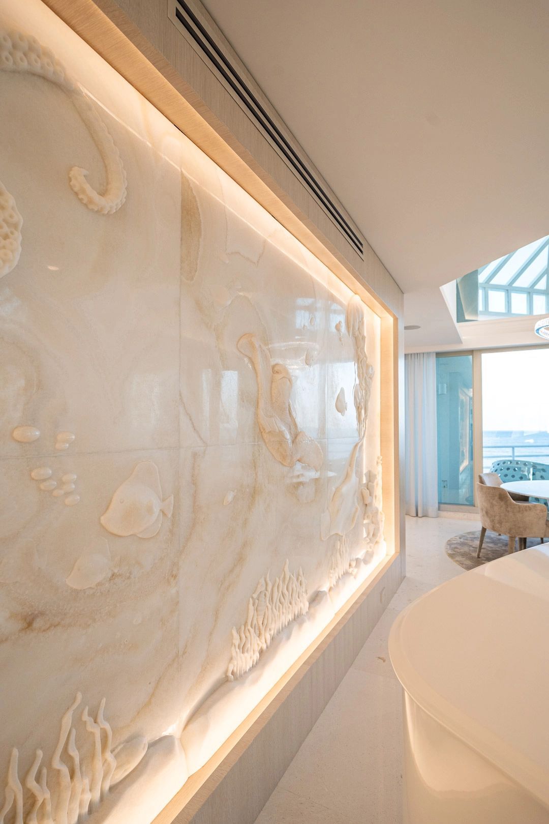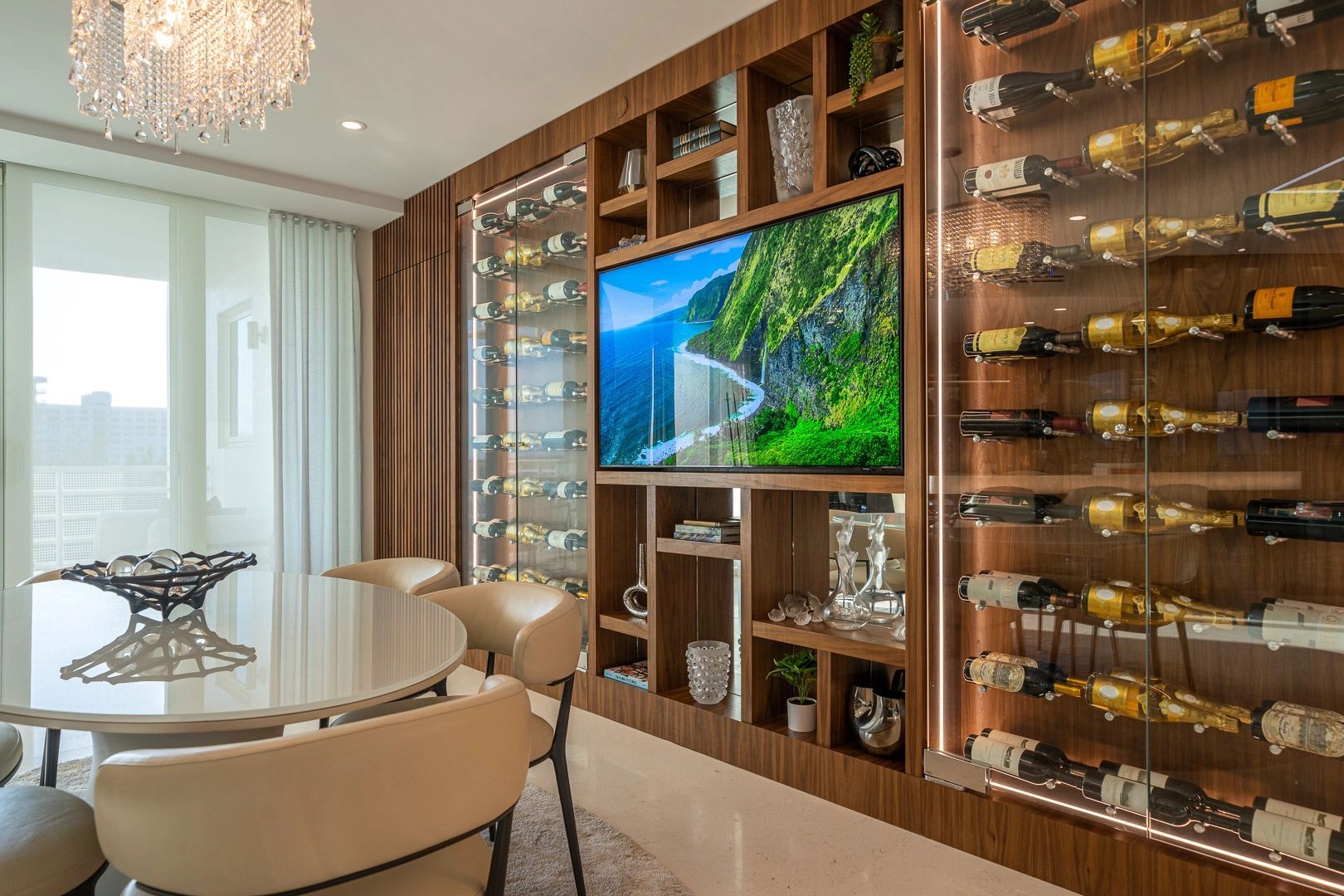 Our custom furniture selection includes pieces from BB Italia, Maxalto, Potocco, and Stark, complemented by cashmere rugs and Swarovski crystal chandeliers. The wine displays are adorned with crystal, and the bar features a collection of Louis XV. With TVs that drop from the ceiling, ocean-facing showers, and countless other exceptional features, this project is a testament to luxury beyond measure."