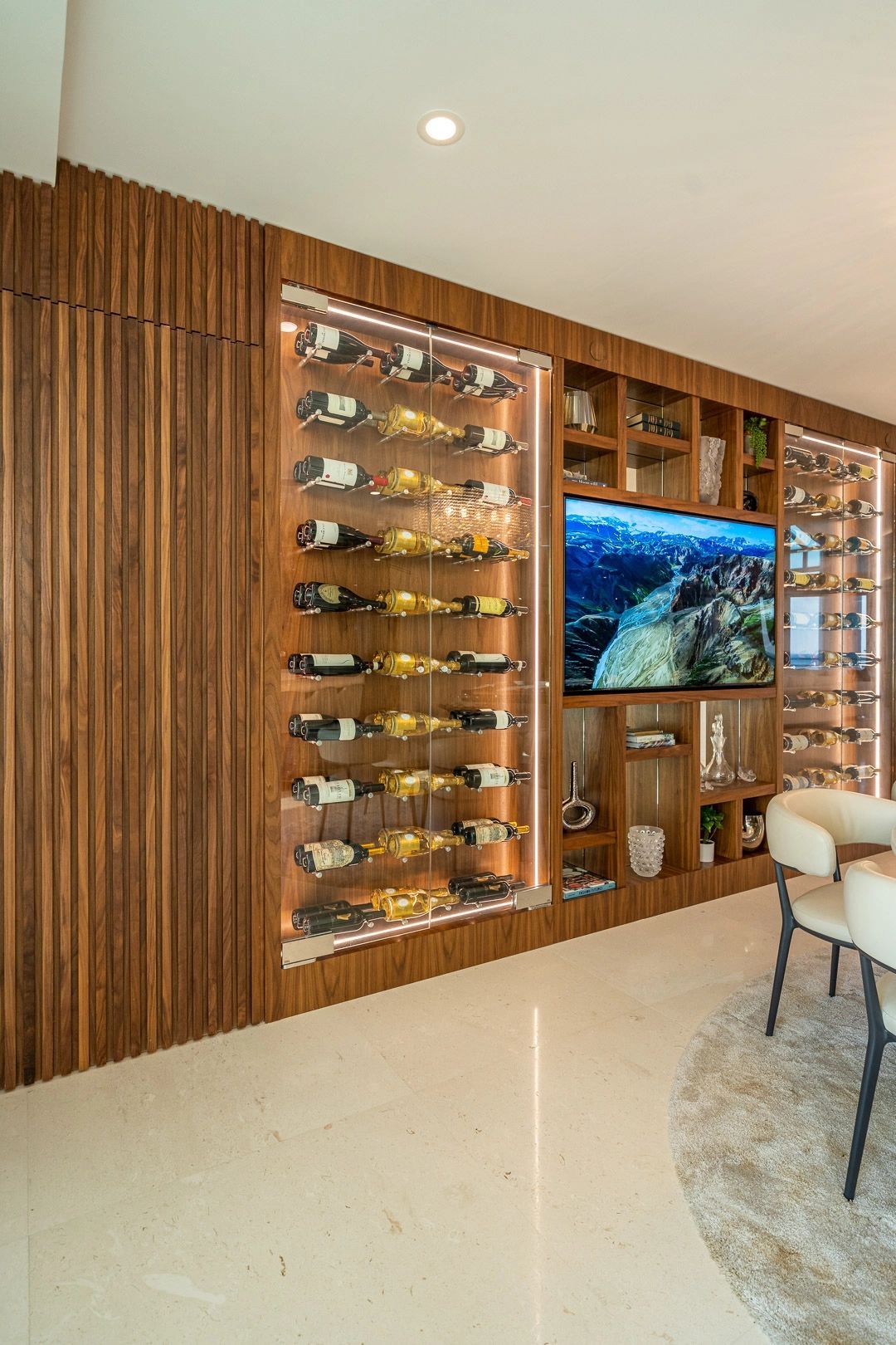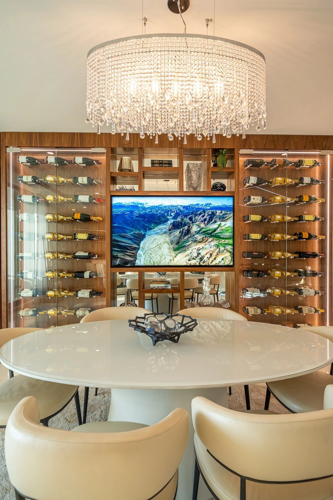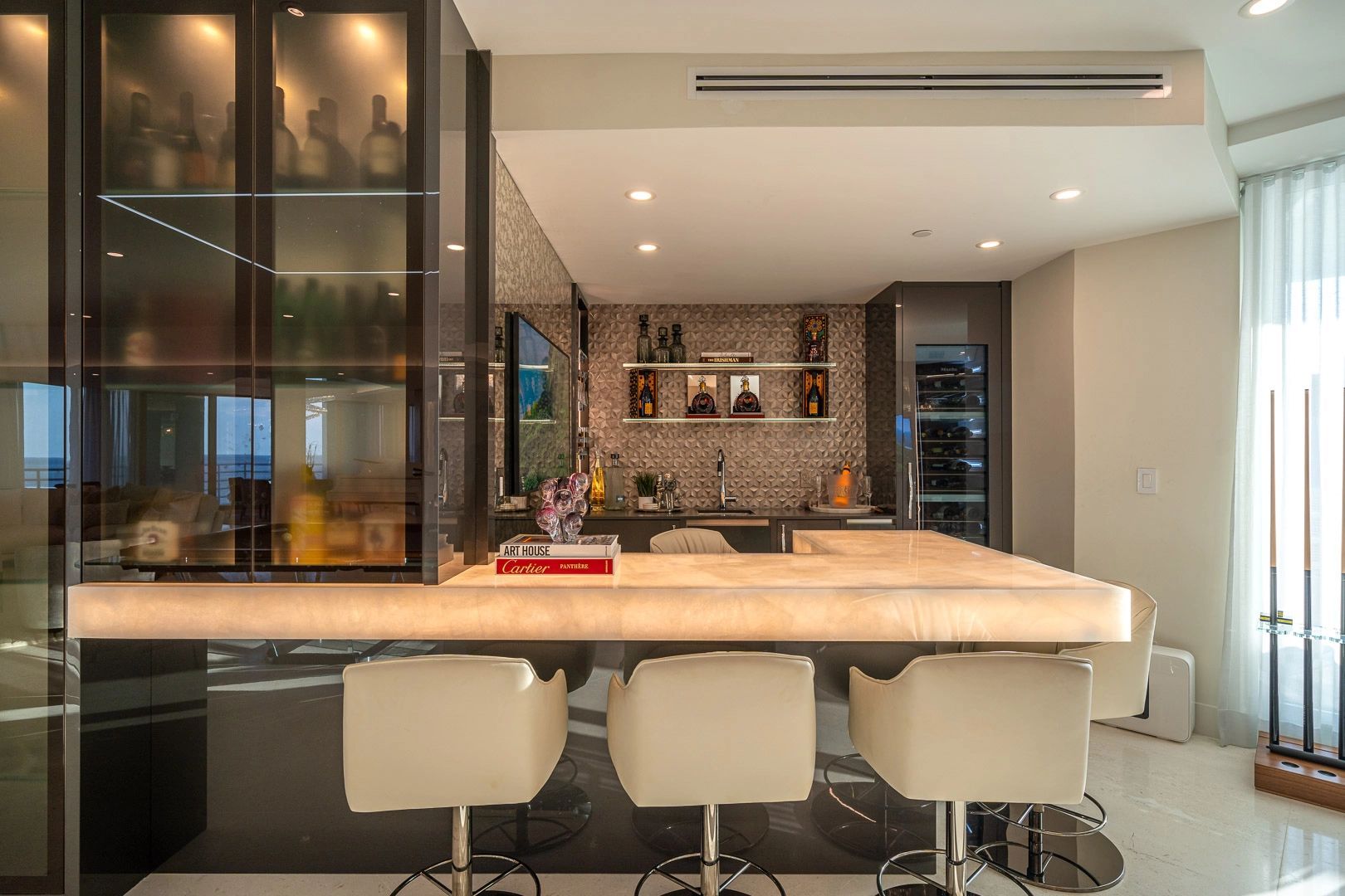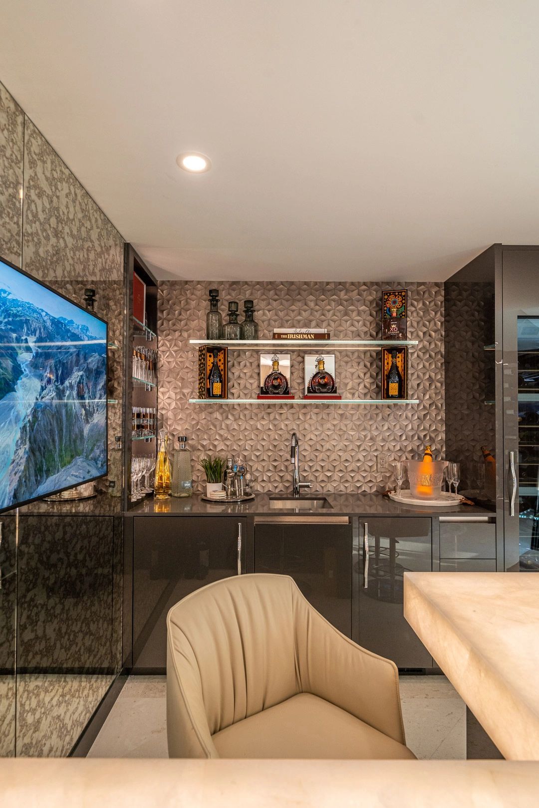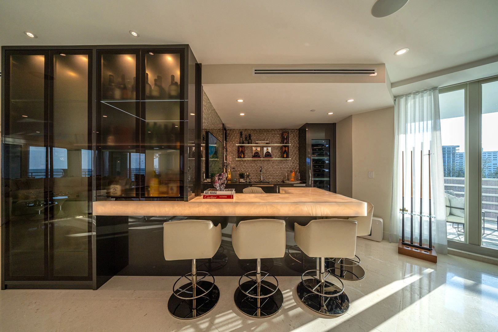 Our custom furniture selection includes pieces from BB Italia, Maxalto, Potocco, and Stark, complemented by cashmere rugs and Swarovski crystal chandeliers. The wine displays are adorned with crystal, and the bar features a collection of Louis XV. With TVs that drop from the ceiling, ocean-facing showers, and countless other exceptional features, this project is a testament to luxury beyond measure."