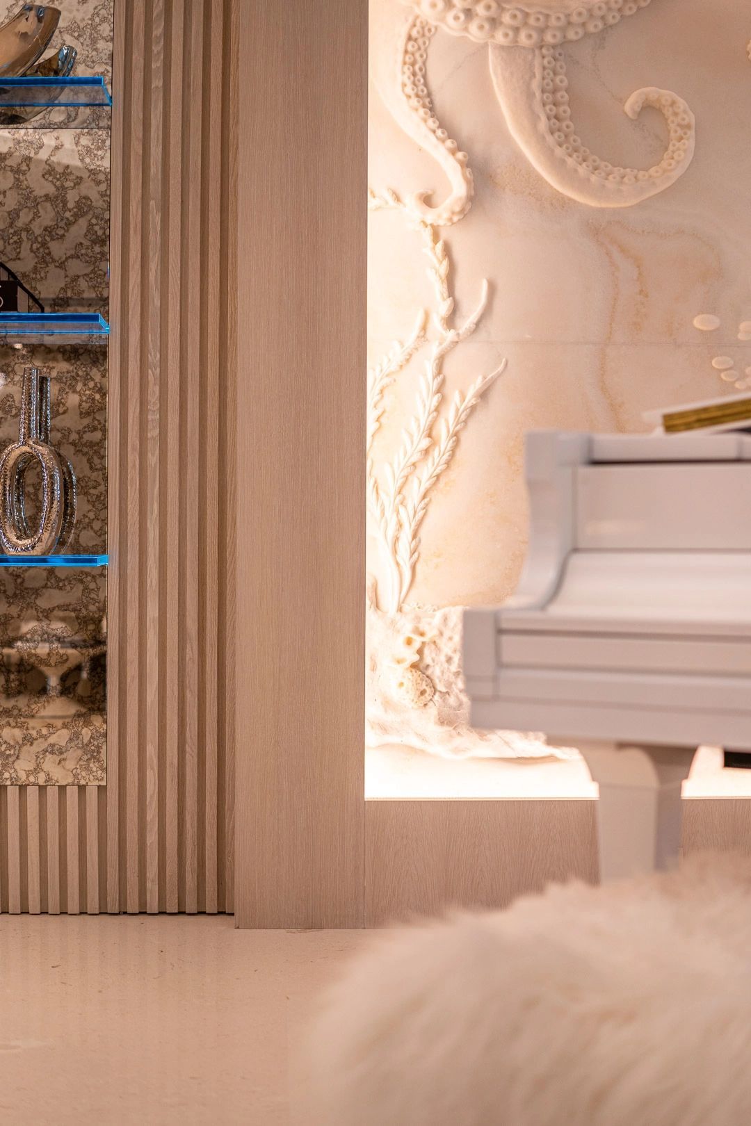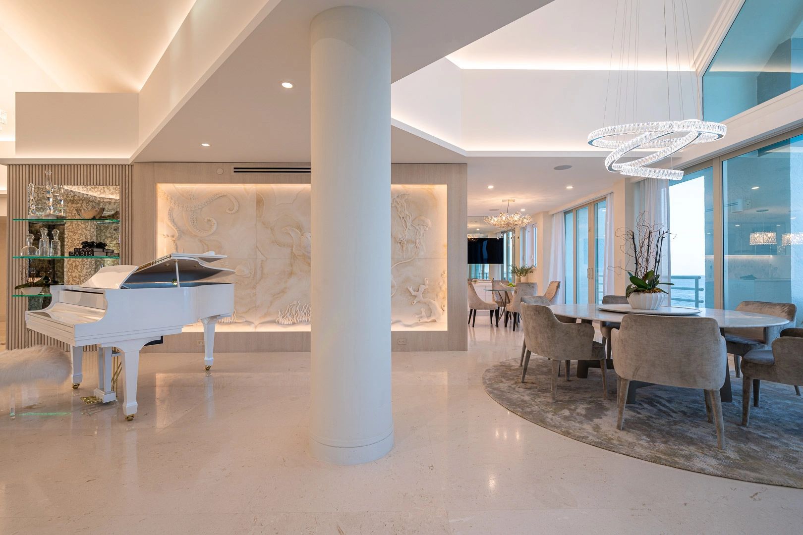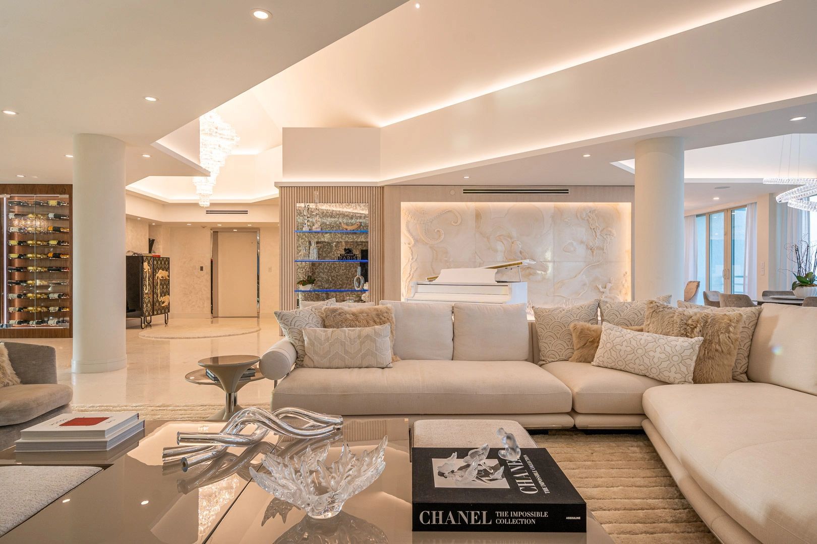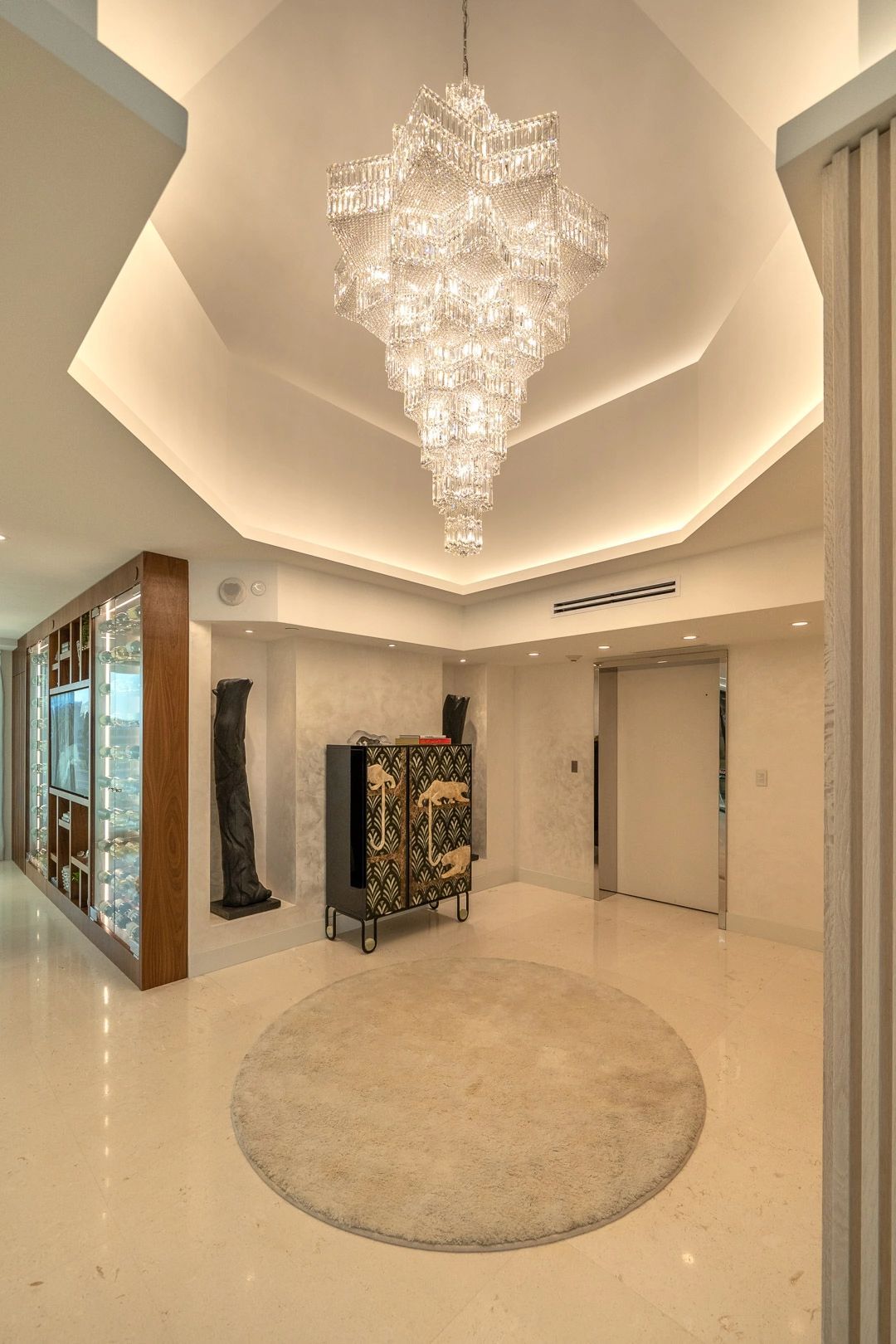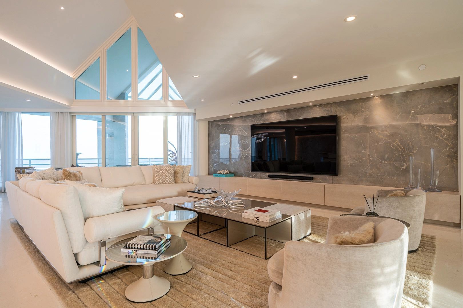 Our custom furniture selection includes pieces from BB Italia, Maxalto, Potocco, and Stark, complemented by cashmere rugs and Swarovski crystal chandeliers. The wine displays are adorned with crystal, and the bar features a collection of Louis XV. With TVs that drop from the ceiling, ocean-facing showers, and countless other exceptional features, this project is a testament to luxury beyond measure."