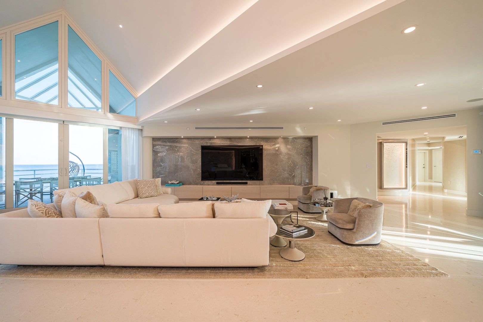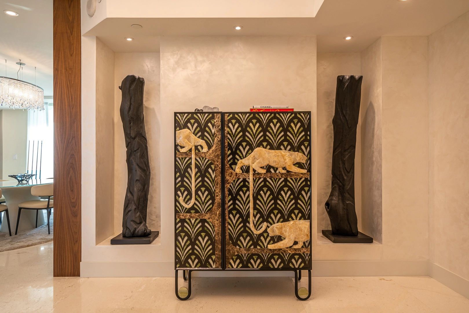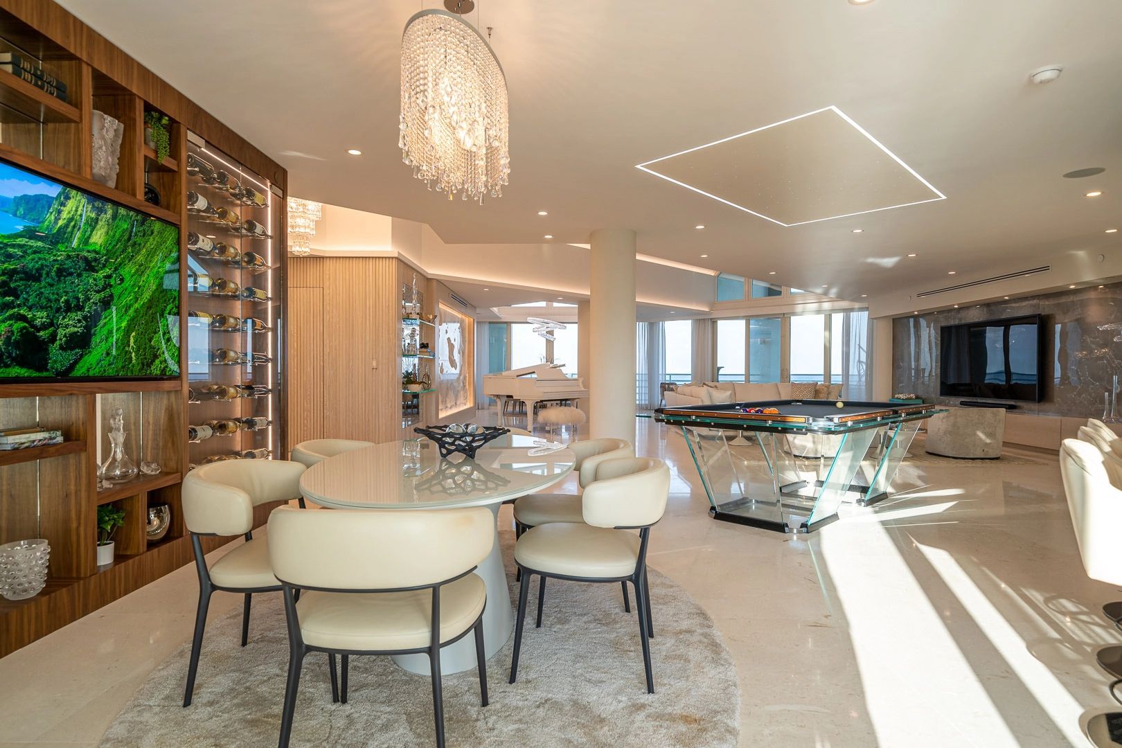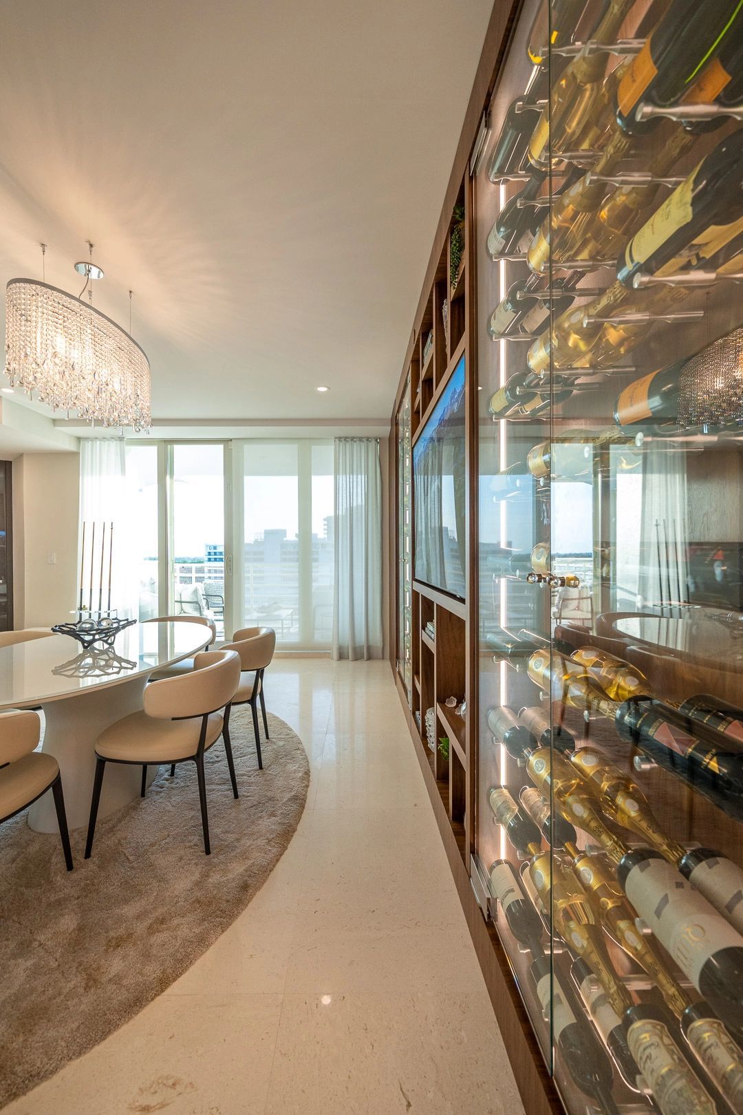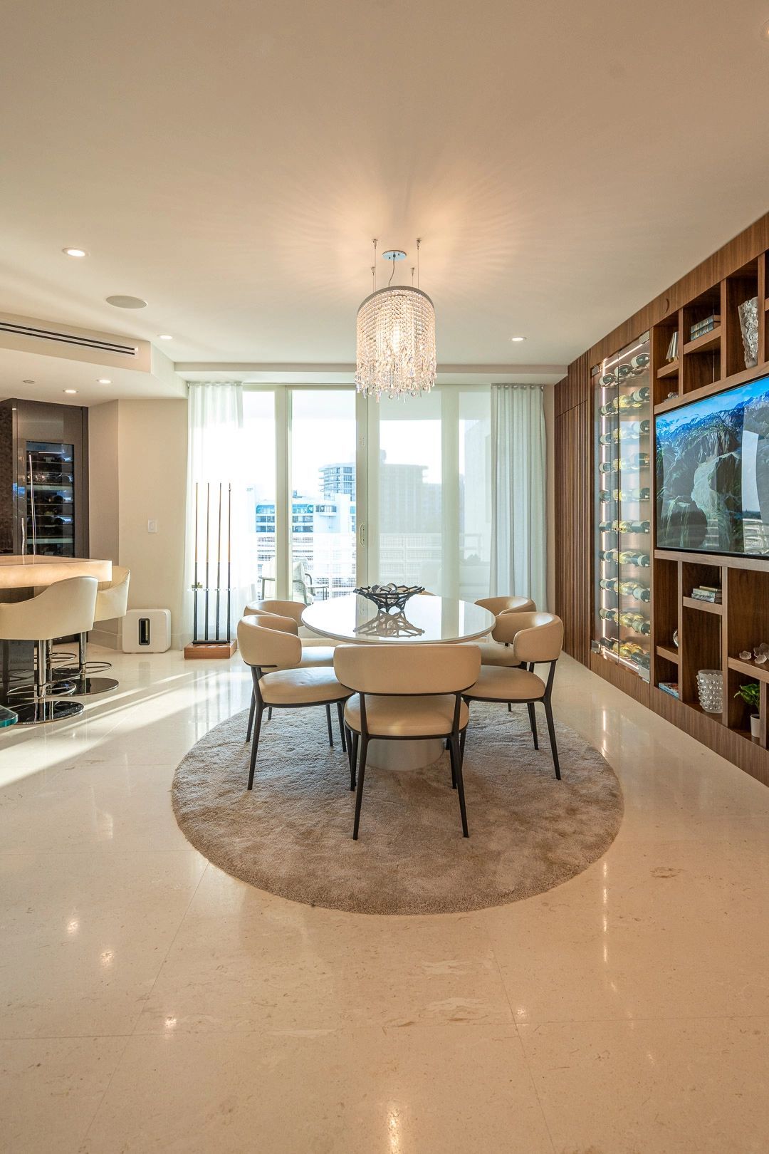 Our custom furniture selection includes pieces from BB Italia, Maxalto, Potocco, and Stark, complemented by cashmere rugs and Swarovski crystal chandeliers. The wine displays are adorned with crystal, and the bar features a collection of Louis XV. With TVs that drop from the ceiling, ocean-facing showers, and countless other exceptional features, this project is a testament to luxury beyond measure."