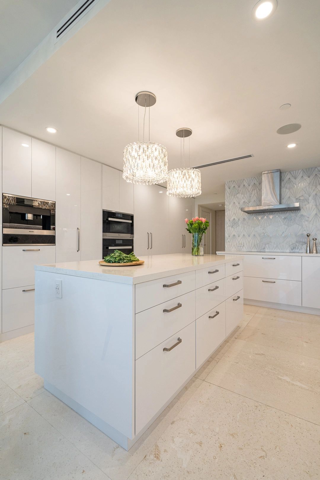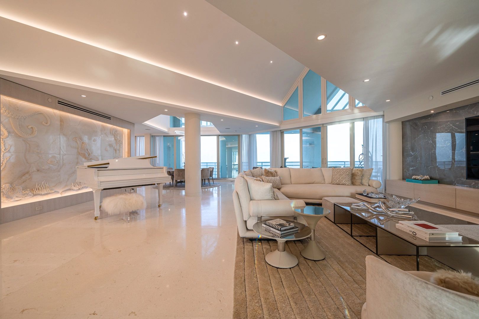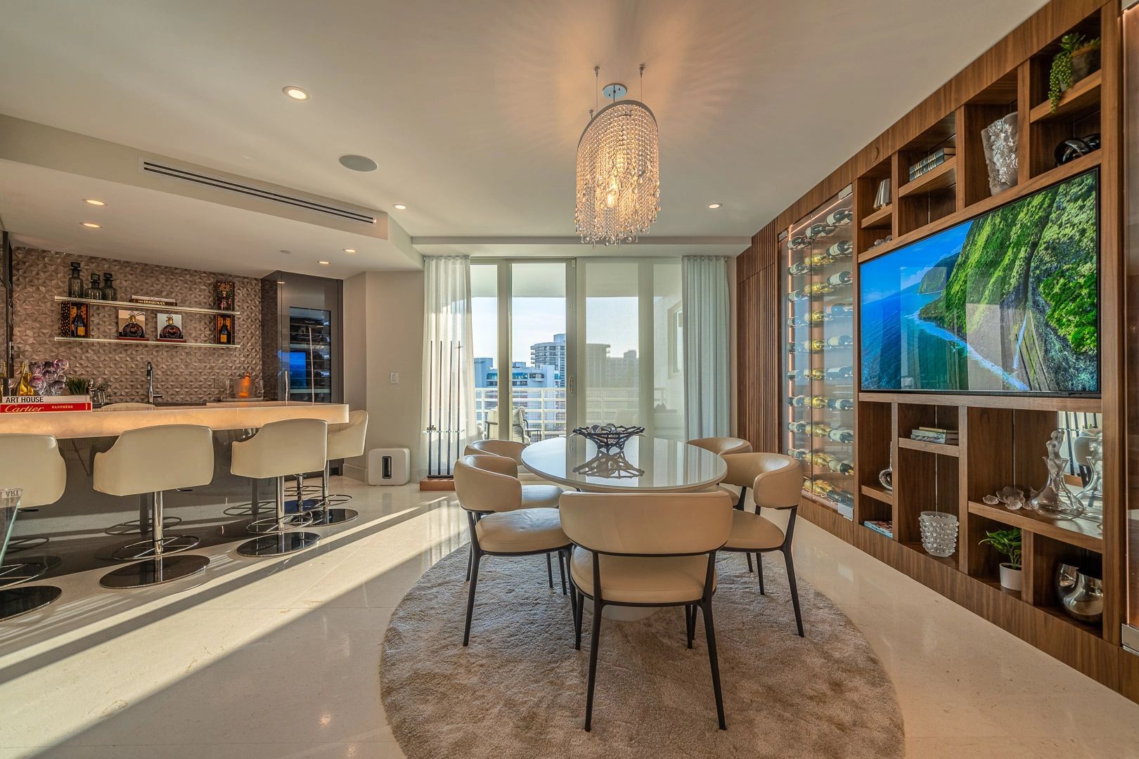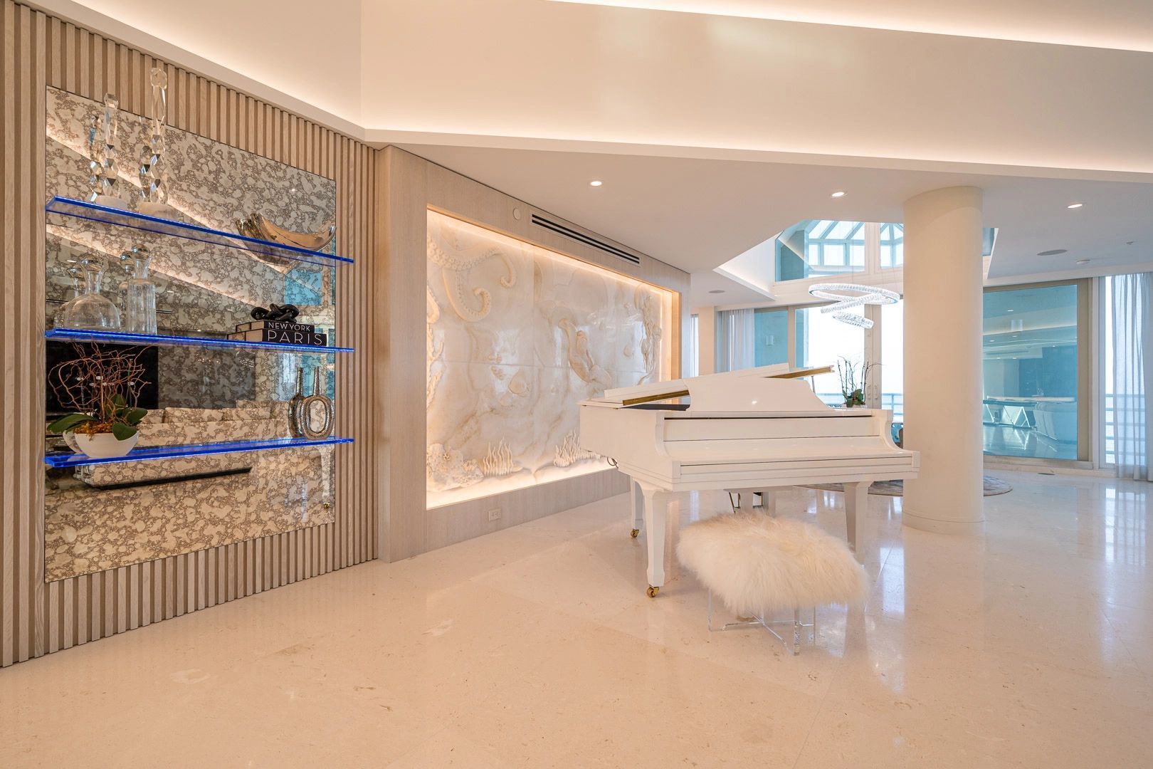 Our custom furniture selection includes pieces from BB Italia, Maxalto, Potocco, and Stark, complemented by cashmere rugs and Swarovski crystal chandeliers. The wine displays are adorned with crystal, and the bar features a collection of Louis XV. With TVs that drop from the ceiling, ocean-facing showers, and countless other exceptional features, this project is a testament to luxury beyond measure."