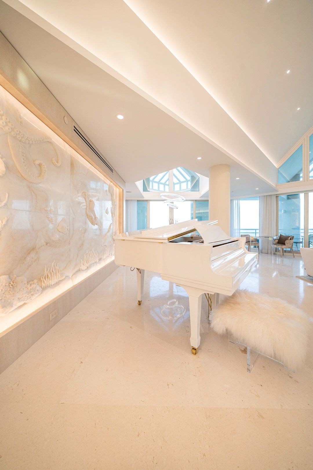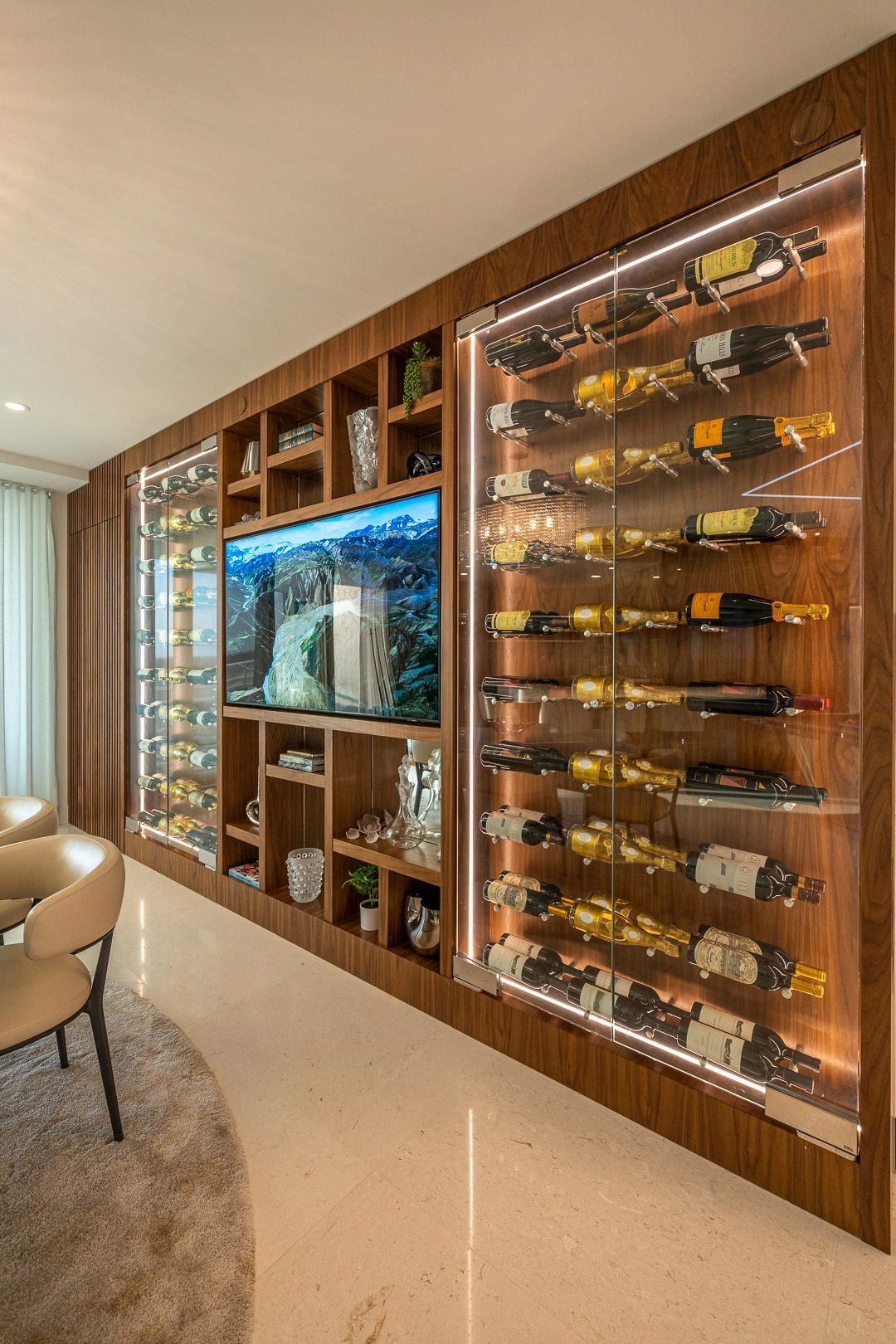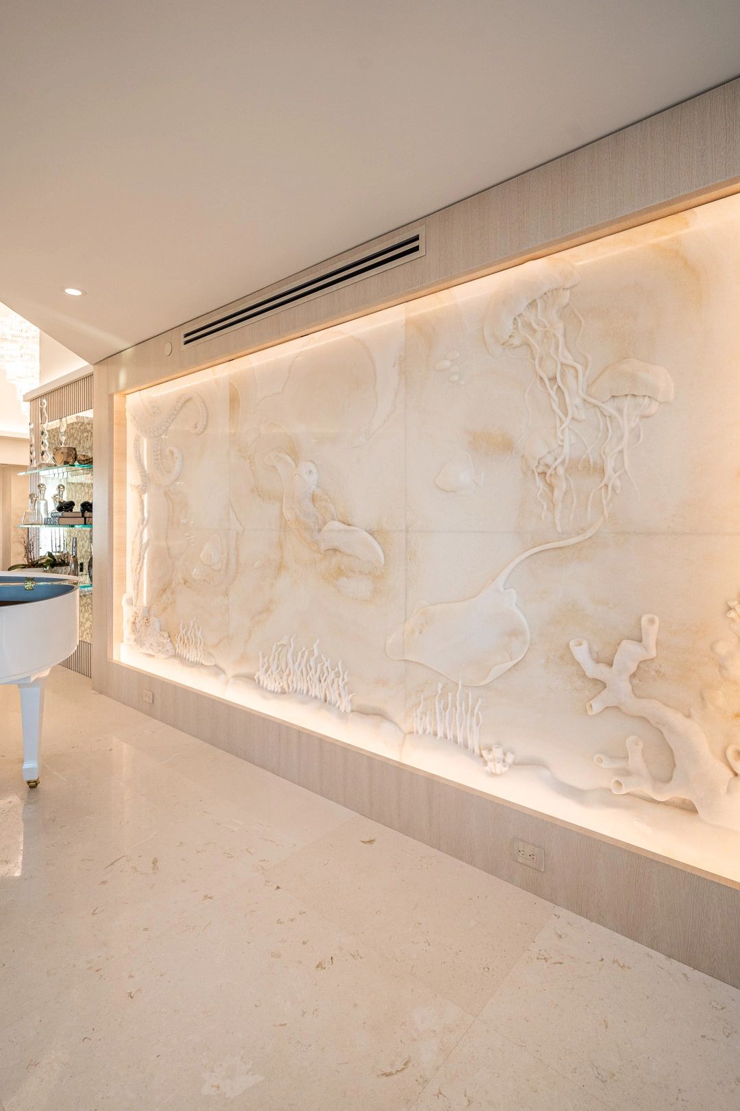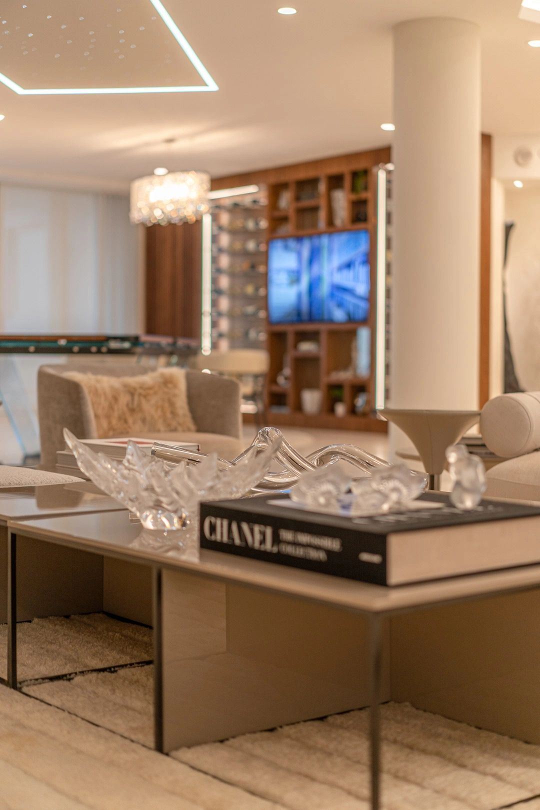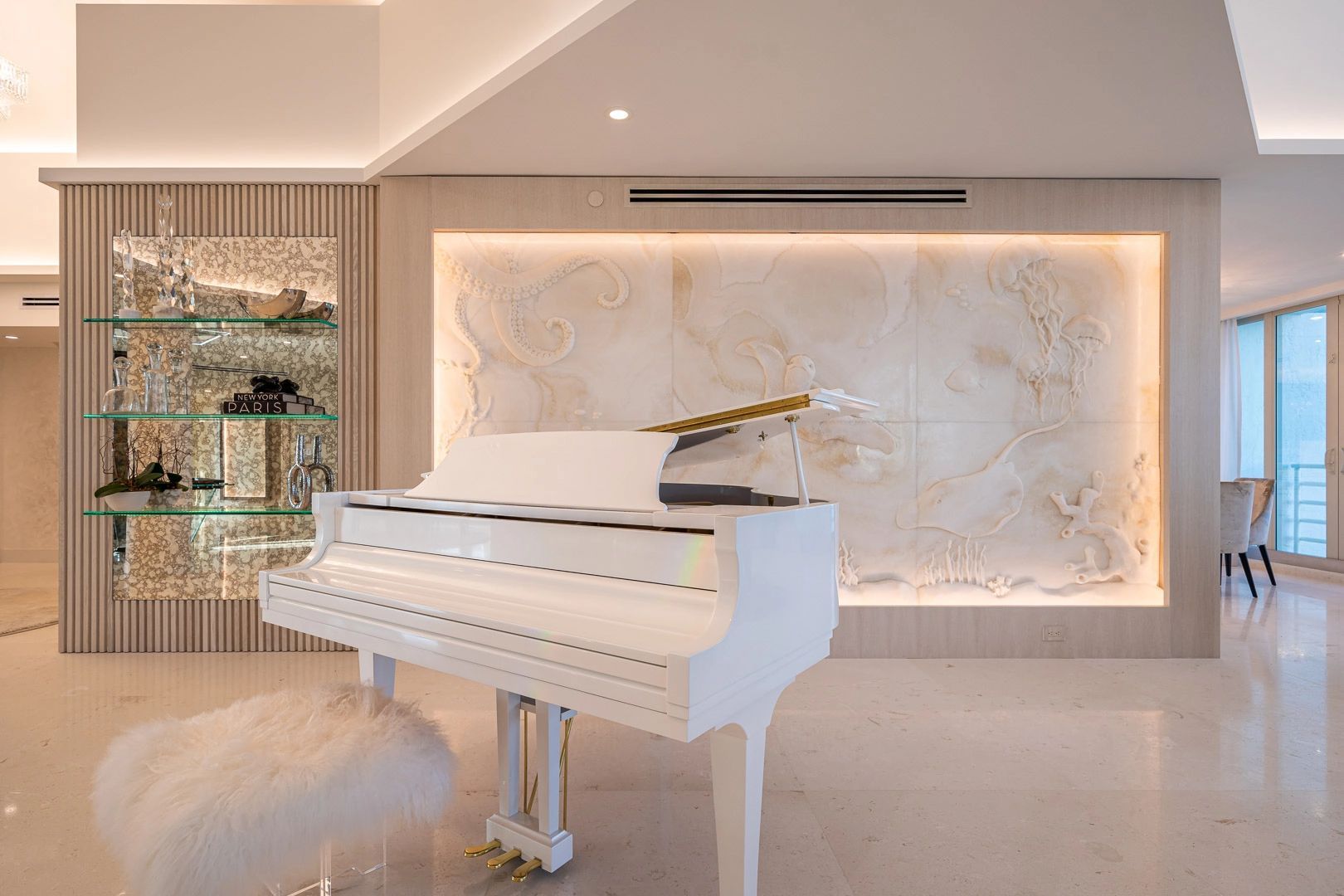 Our custom furniture selection includes pieces from BB Italia, Maxalto, Potocco, and Stark, complemented by cashmere rugs and Swarovski crystal chandeliers. The wine displays are adorned with crystal, and the bar features a collection of Louis XV. With TVs that drop from the ceiling, ocean-facing showers, and countless other exceptional features, this project is a testament to luxury beyond measure."