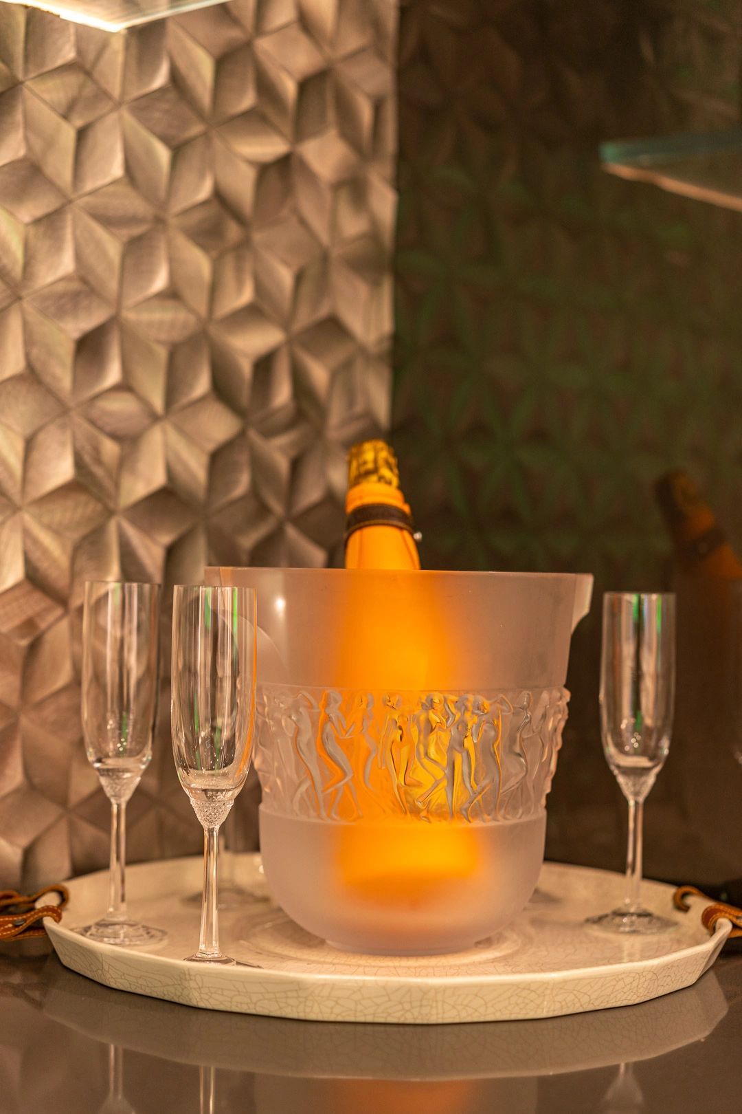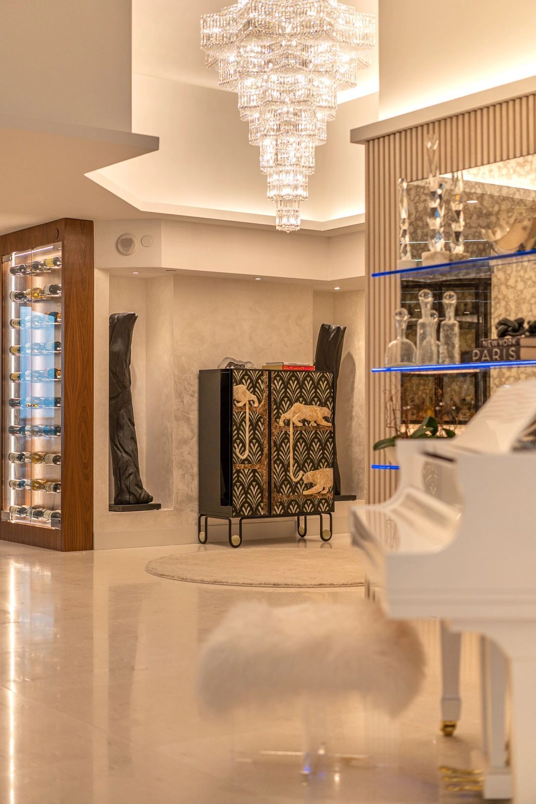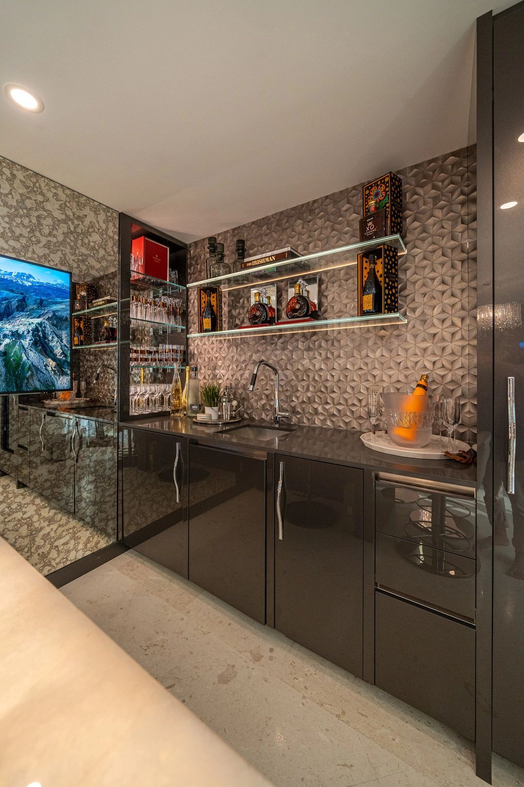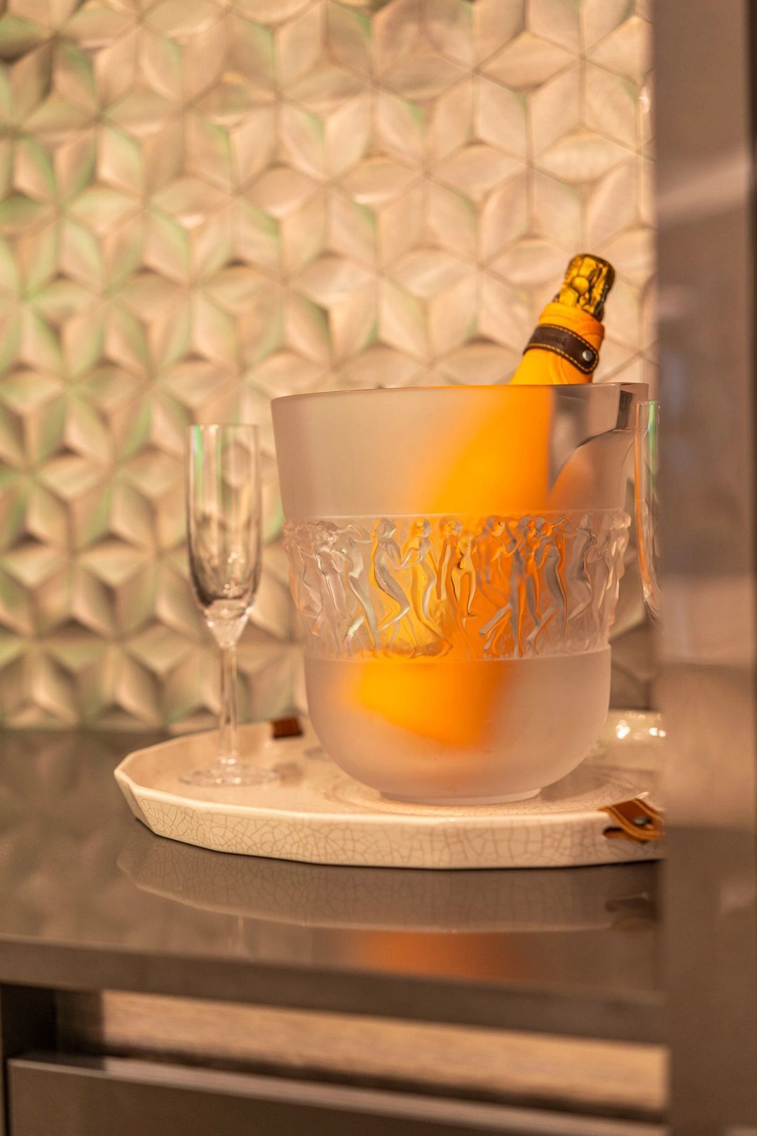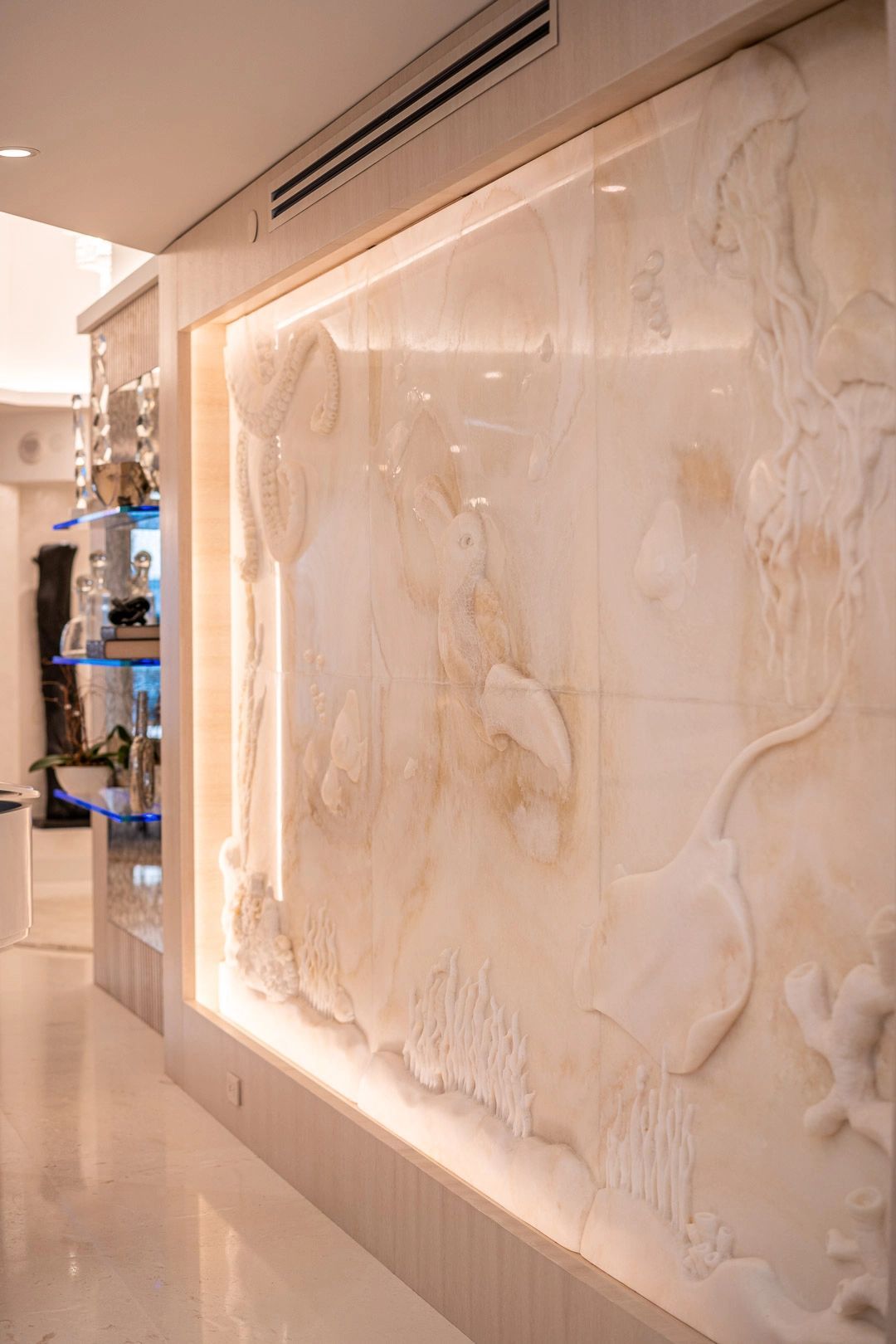 Our custom furniture selection includes pieces from BB Italia, Maxalto, Potocco, and Stark, complemented by cashmere rugs and Swarovski crystal chandeliers. The wine displays are adorned with crystal, and the bar features a collection of Louis XV. With TVs that drop from the ceiling, ocean-facing showers, and countless other exceptional features, this project is a testament to luxury beyond measure."