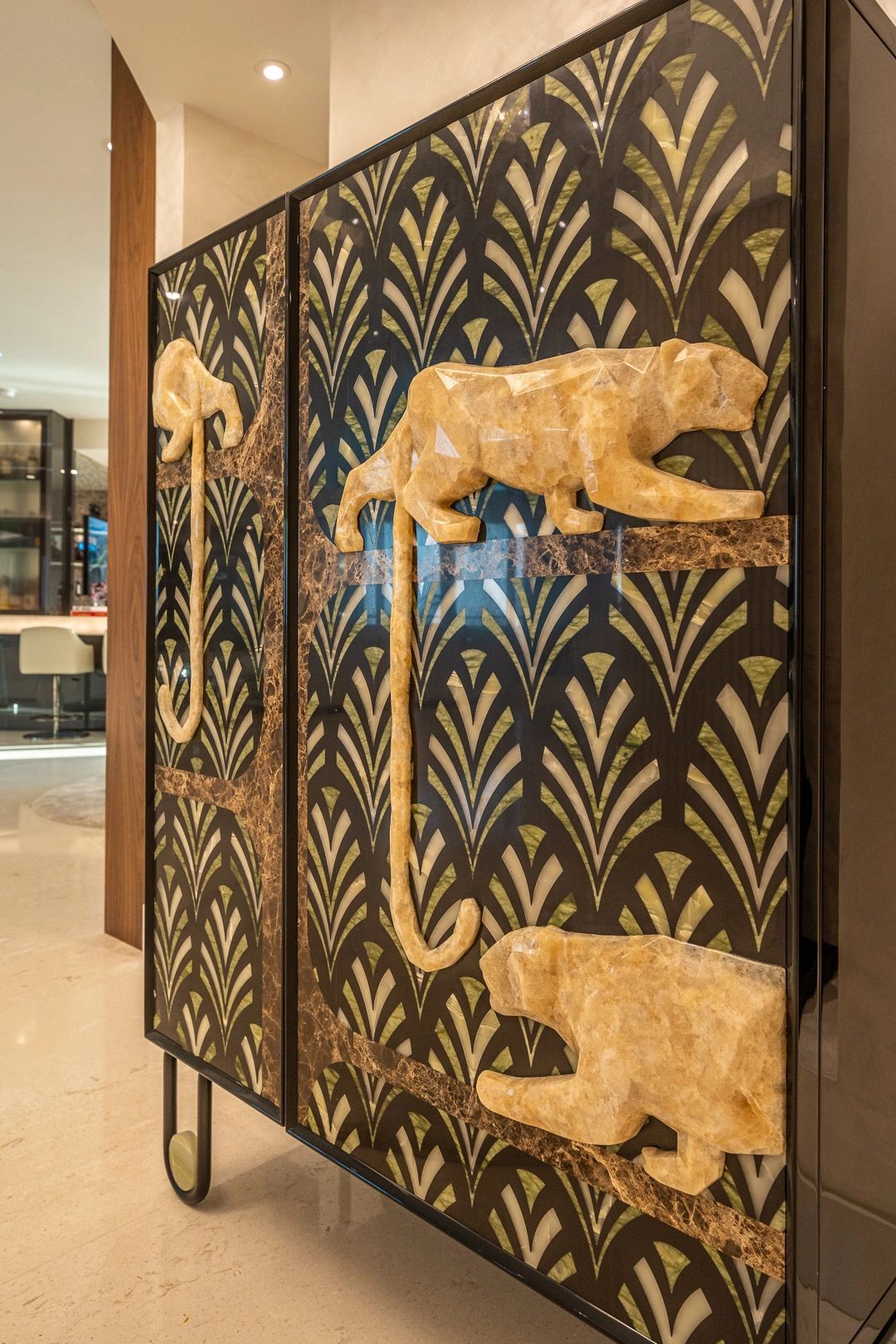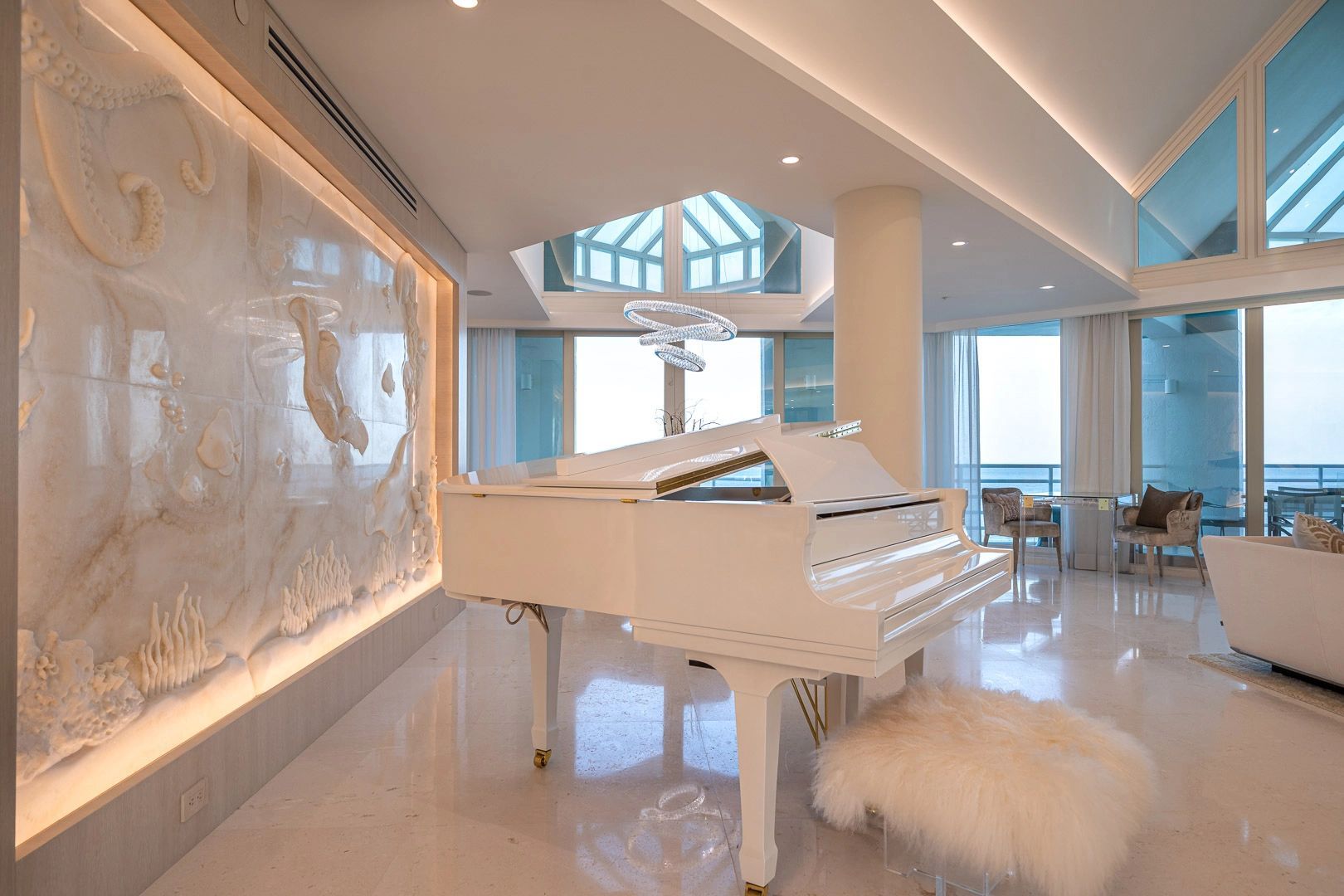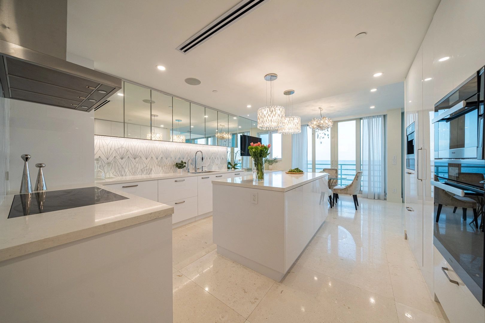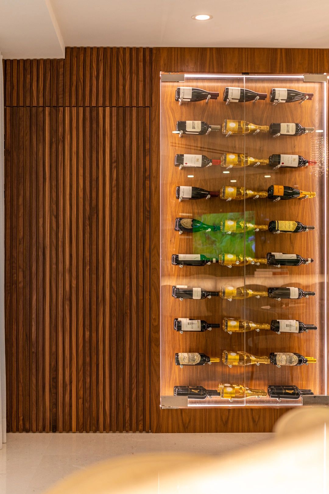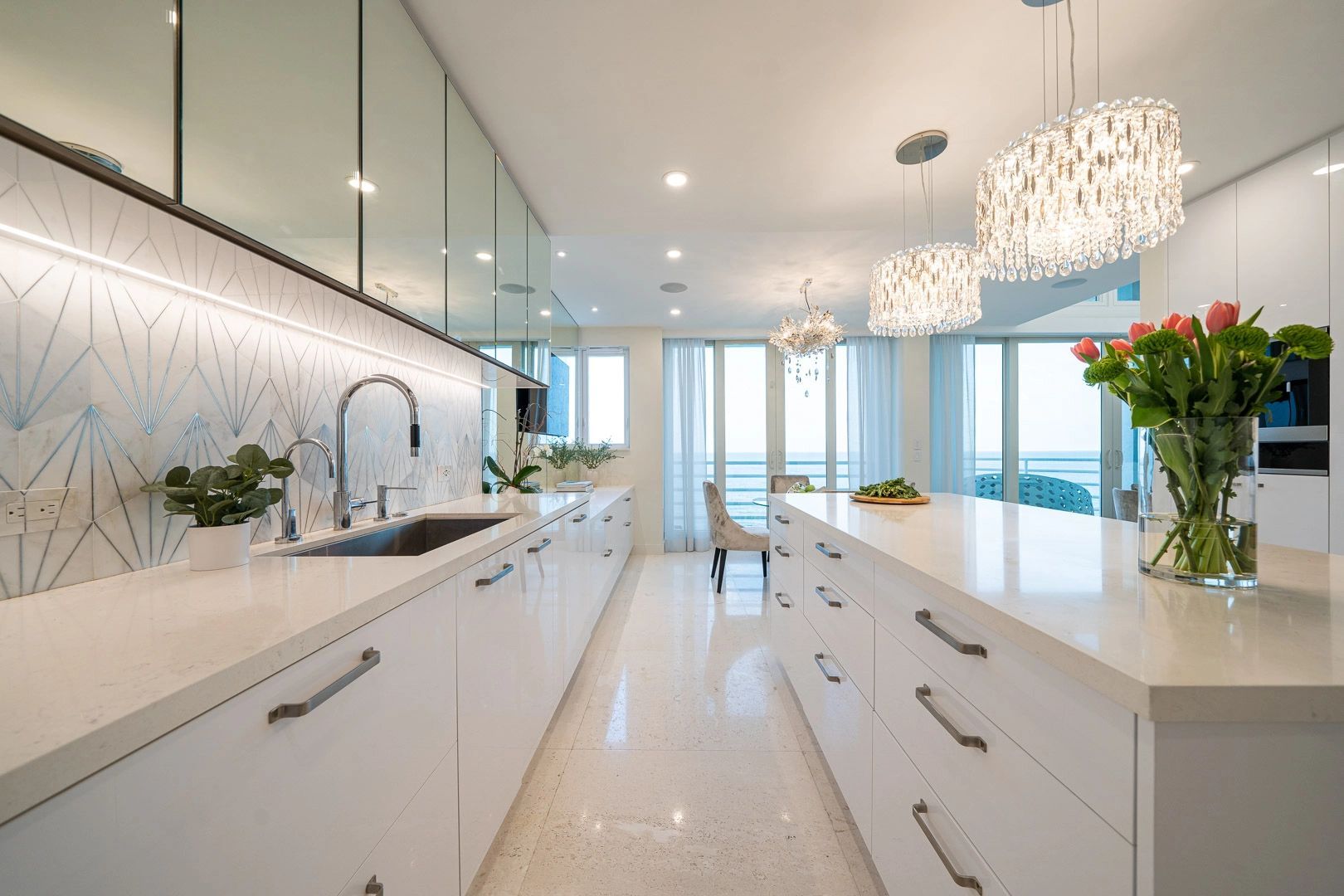 Our custom furniture selection includes pieces from BB Italia, Maxalto, Potocco, and Stark, complemented by cashmere rugs and Swarovski crystal chandeliers. The wine displays are adorned with crystal, and the bar features a collection of Louis XV. With TVs that drop from the ceiling, ocean-facing showers, and countless other exceptional features, this project is a testament to luxury beyond measure."