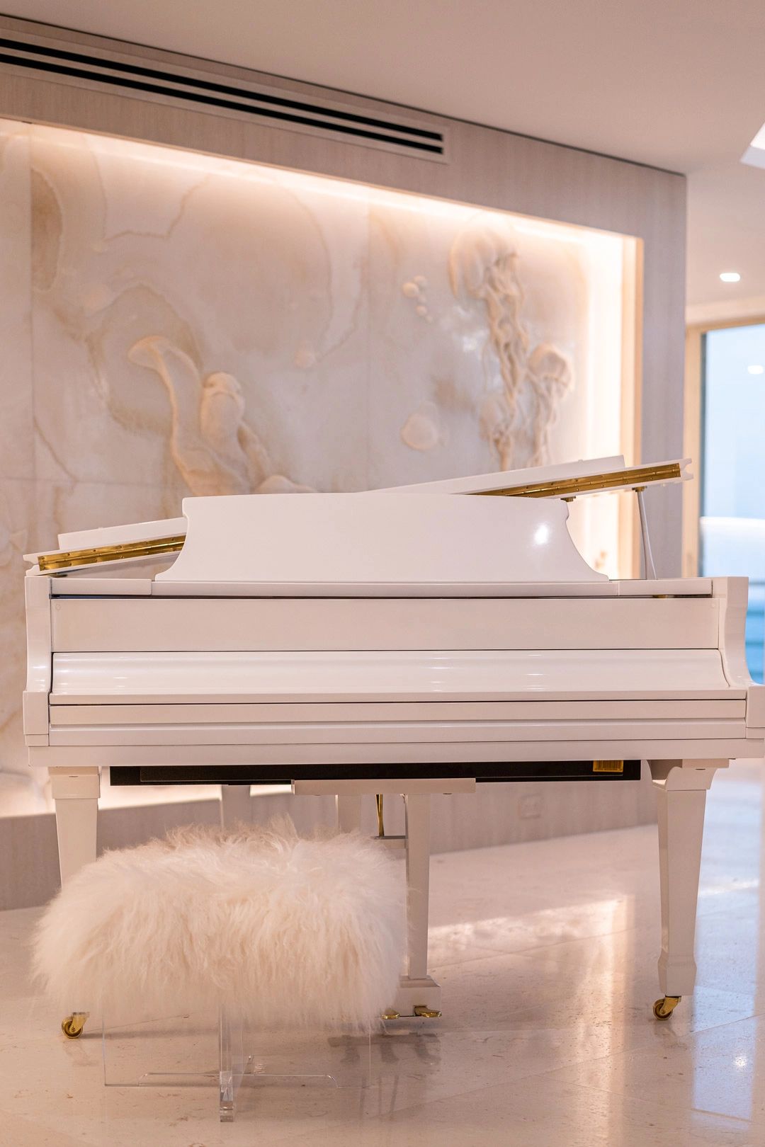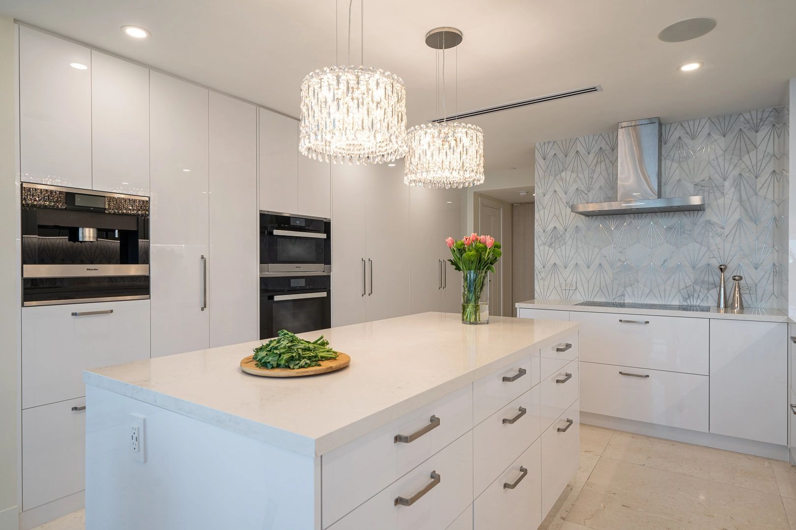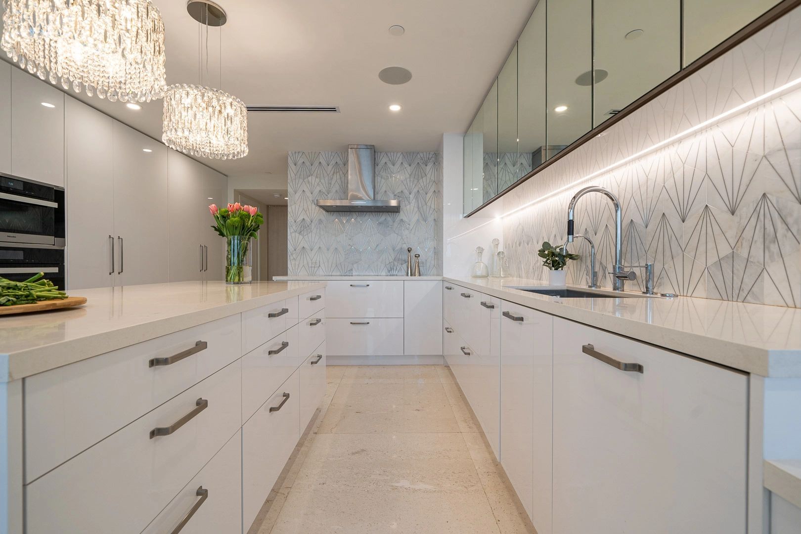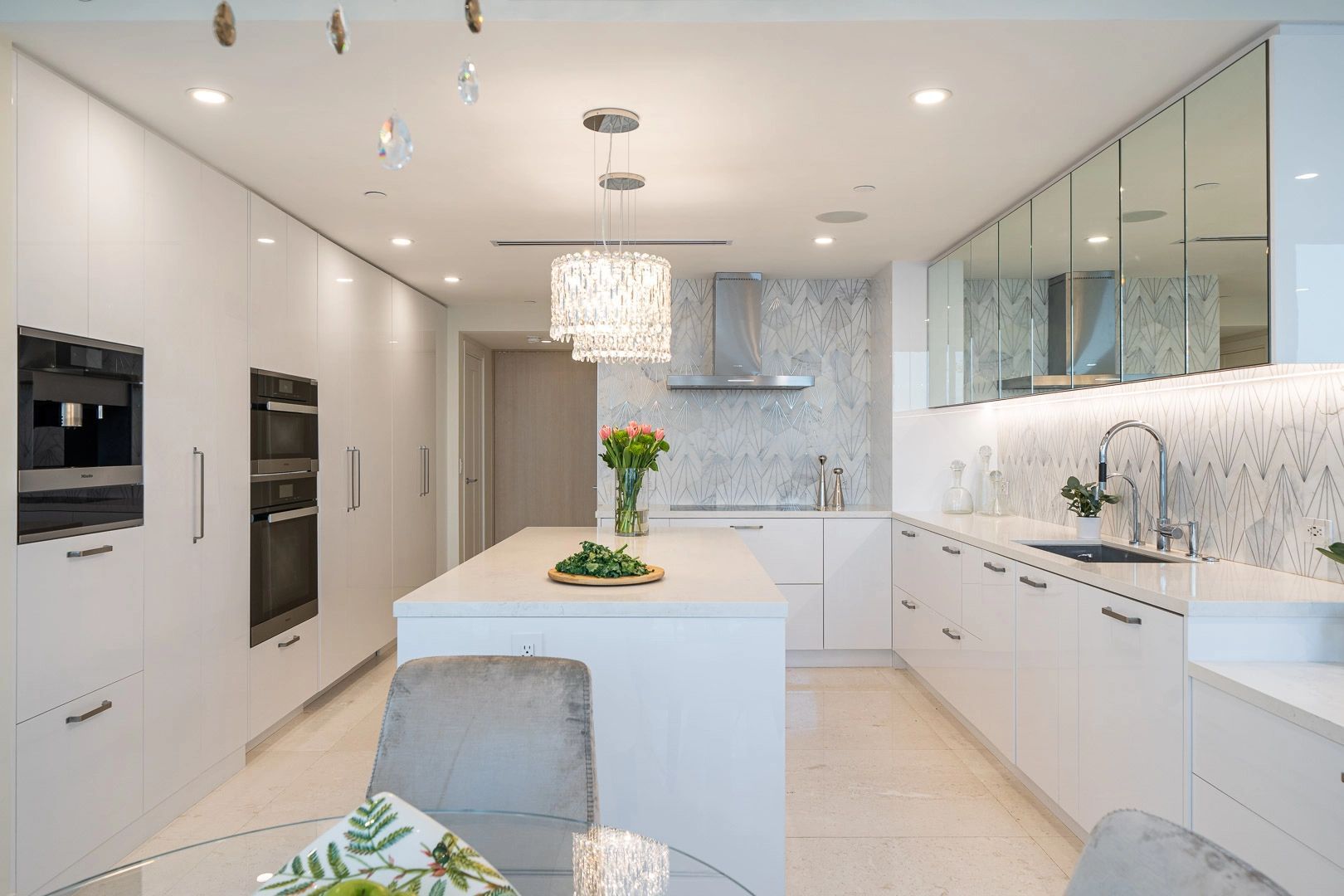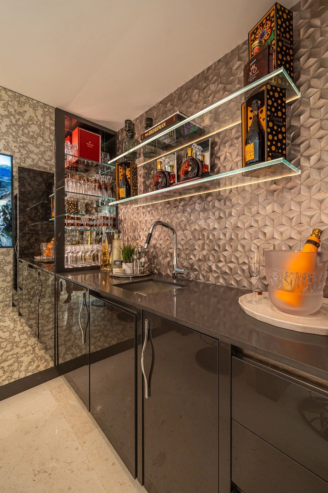 Our custom furniture selection includes pieces from BB Italia, Maxalto, Potocco, and Stark, complemented by cashmere rugs and Swarovski crystal chandeliers. The wine displays are adorned with crystal, and the bar features a collection of Louis XV. With TVs that drop from the ceiling, ocean-facing showers, and countless other exceptional features, this project is a testament to luxury beyond measure."