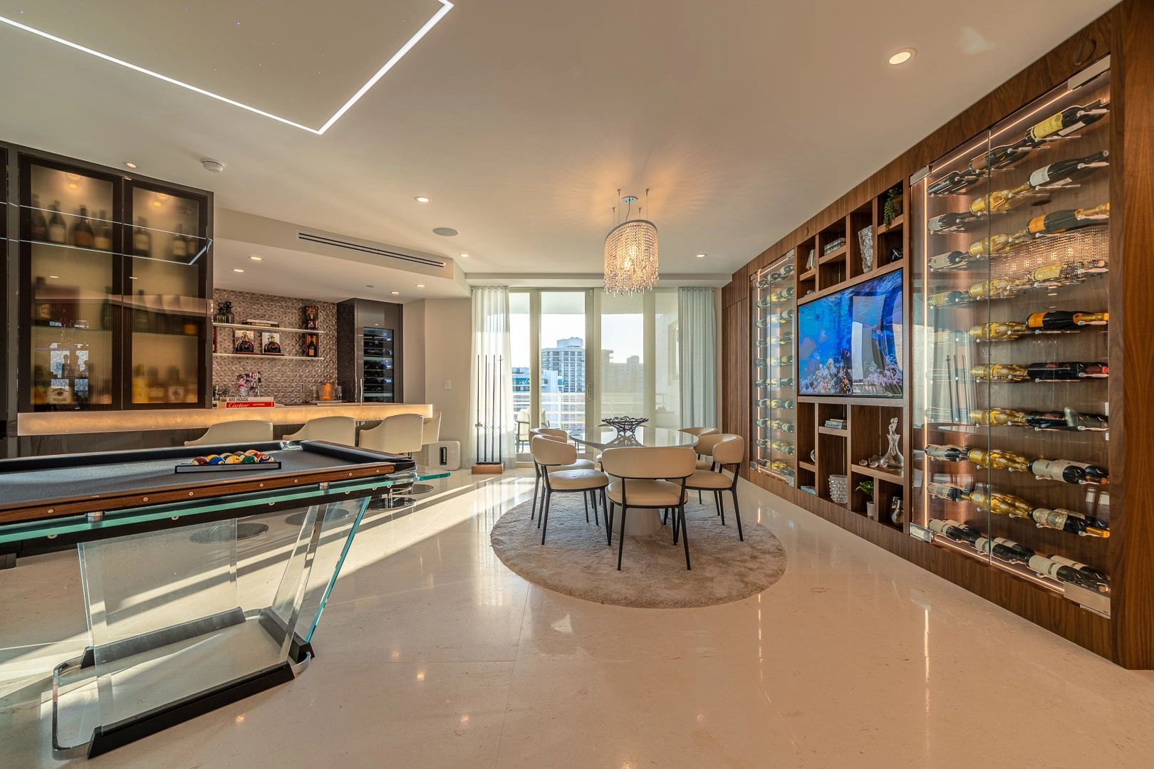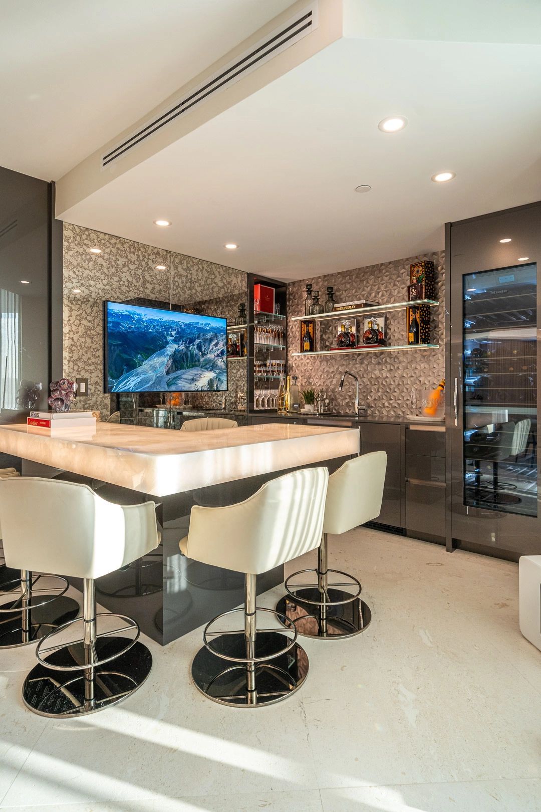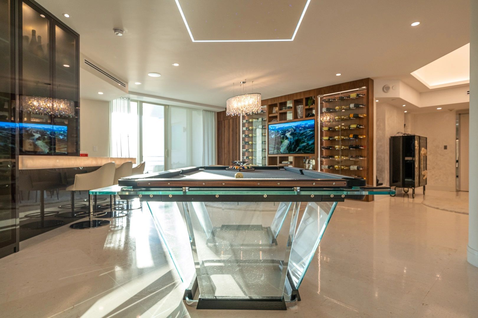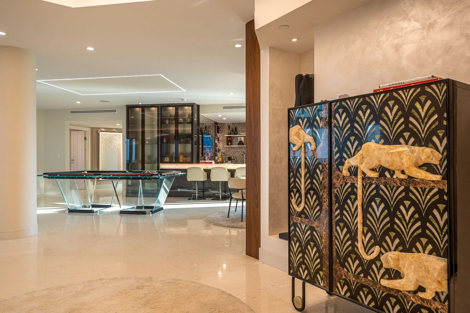 This project showcases the finest materials and craftsmanship, boasting an extensive array of premium elements. Every detail exudes luxury, from Seura mirror TVs to a Teckell pool table, a custom-designed Citco marble sculpture, and exquisite limestone floors. The custom bar features Kristallo translucent stone, complemented by Alex Turco wall panels. Complete automation, top-choice Lutron shades, a 100'' TV, and a state-of-the-art home theater add to the luxury.