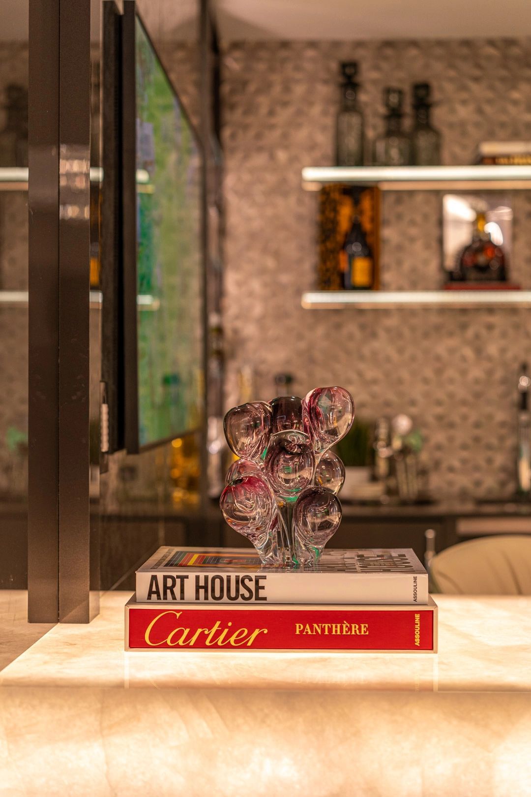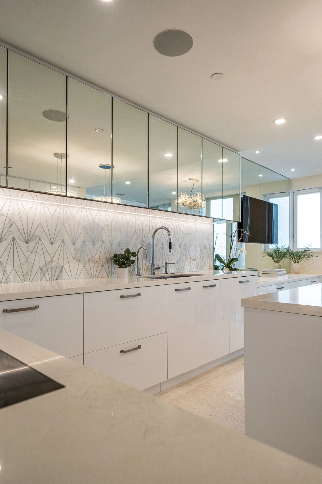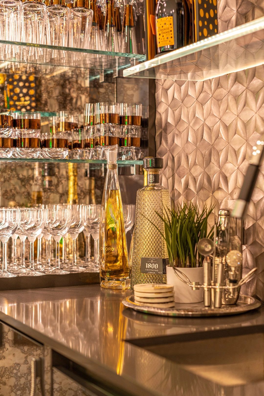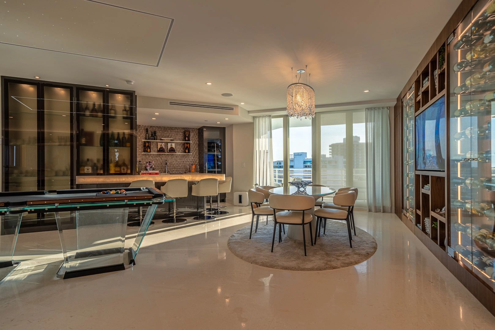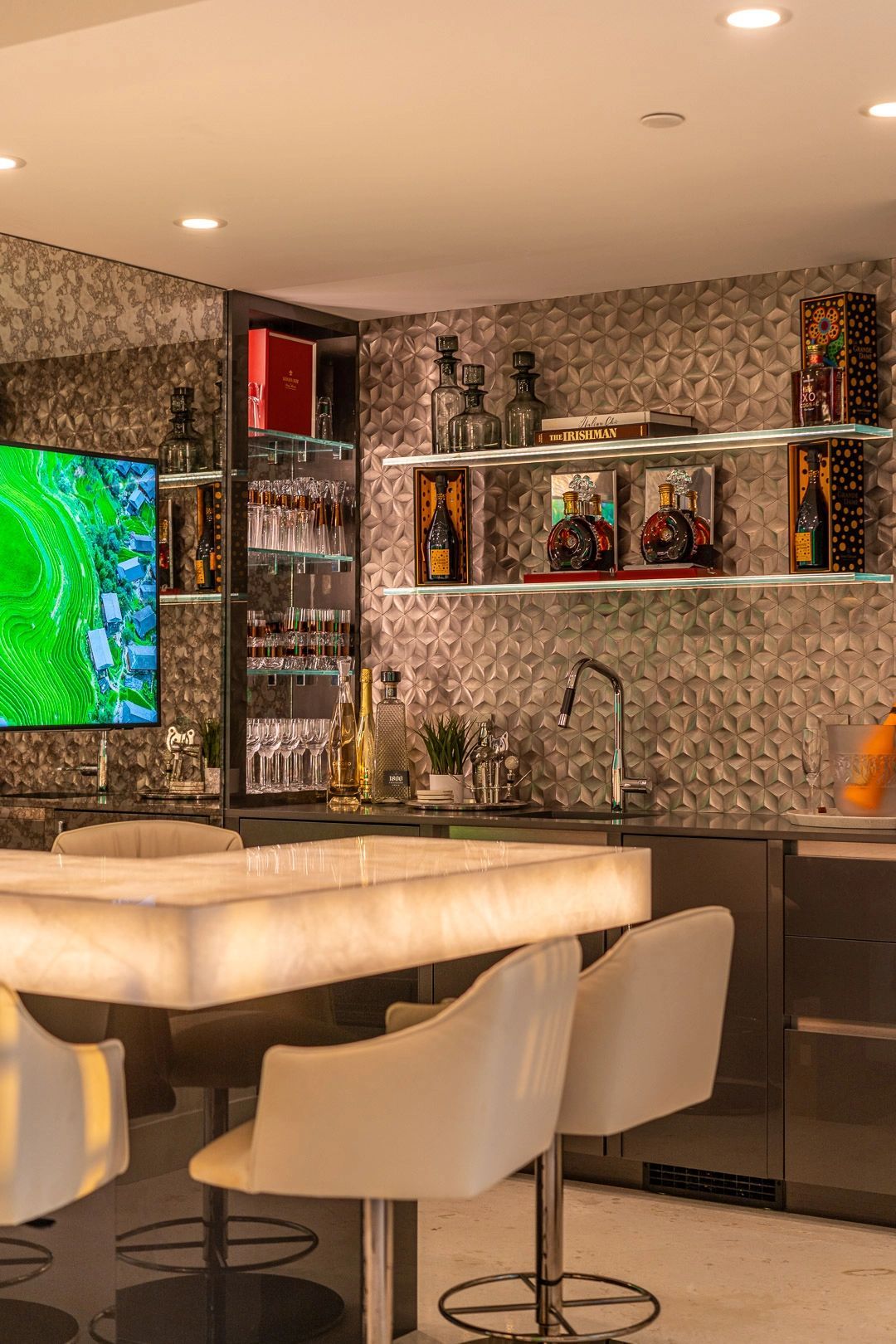 This project showcases the finest materials and craftsmanship, boasting an extensive array of premium elements. Every detail exudes luxury, from Seura mirror TVs to a Teckell pool table, a custom-designed Citco marble sculpture, and exquisite limestone floors. The custom bar features Kristallo translucent stone, complemented by Alex Turco wall panels. Complete automation, top-choice Lutron shades, a 100'' TV, and a state-of-the-art home theater add to the luxury.